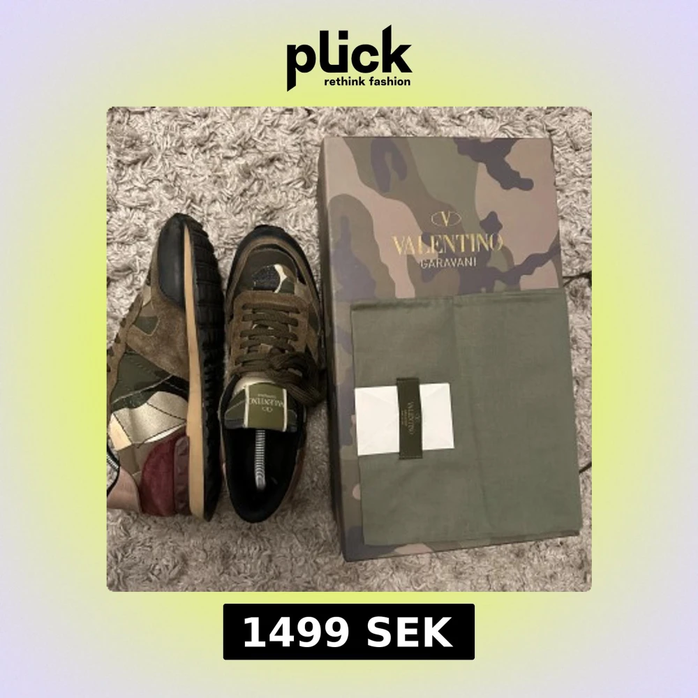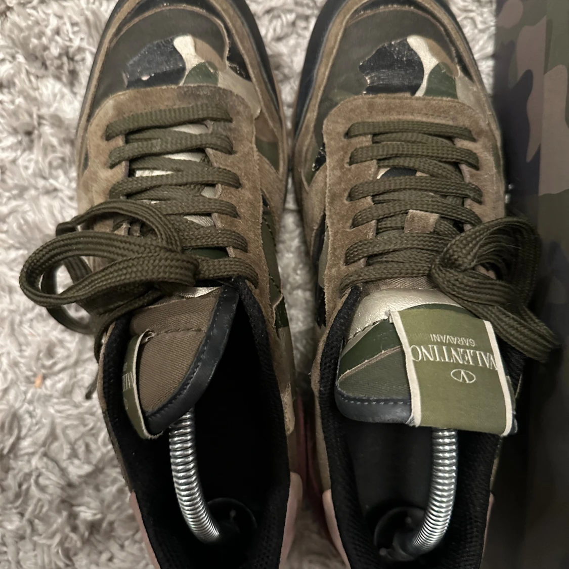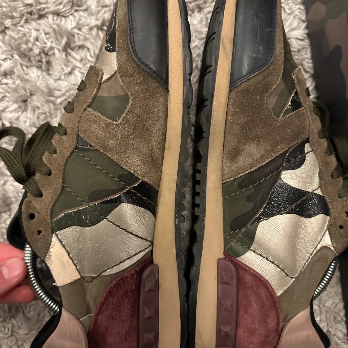 Snygga Valentino Rockrunner sneakers med camouflagemönster i grönt, brunt, beige och svart. Skorna har detaljer i mocka och skinn, platt sula och rund tå. Endast skorna medföljer. Klassisk snörning och coola vinröda partier vid hälen. Perfekt för dig som gillar streetstyle och exklusiva märken.