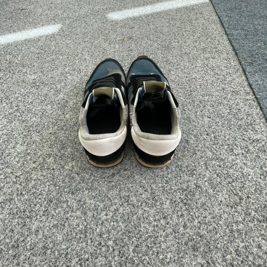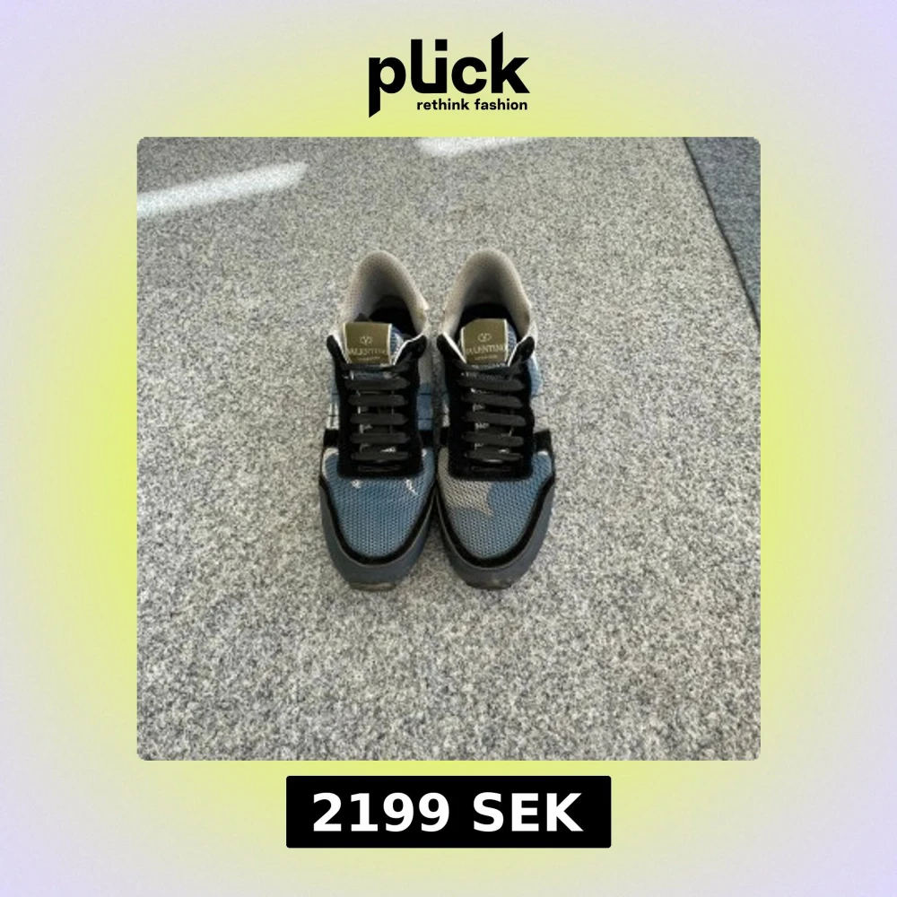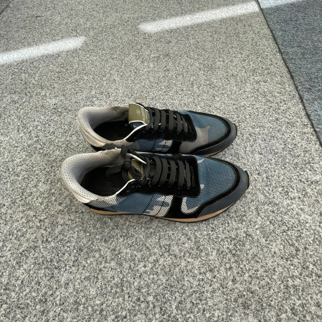 Snygga Valentino Garavani sneakers med blått och svart camouflage-mönster, svarta snören och beige detaljer. Ovandelen är i mesh och skinn, med en robust gummisula och rund tå. Perfekt för dig som gillar exklusiv stil med sköna vibbar.