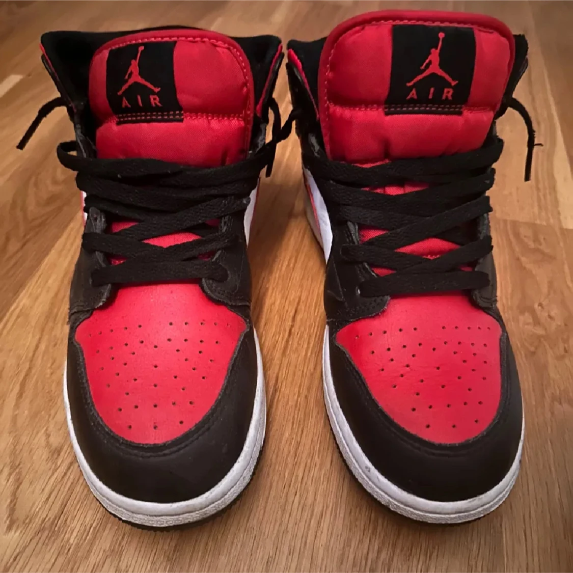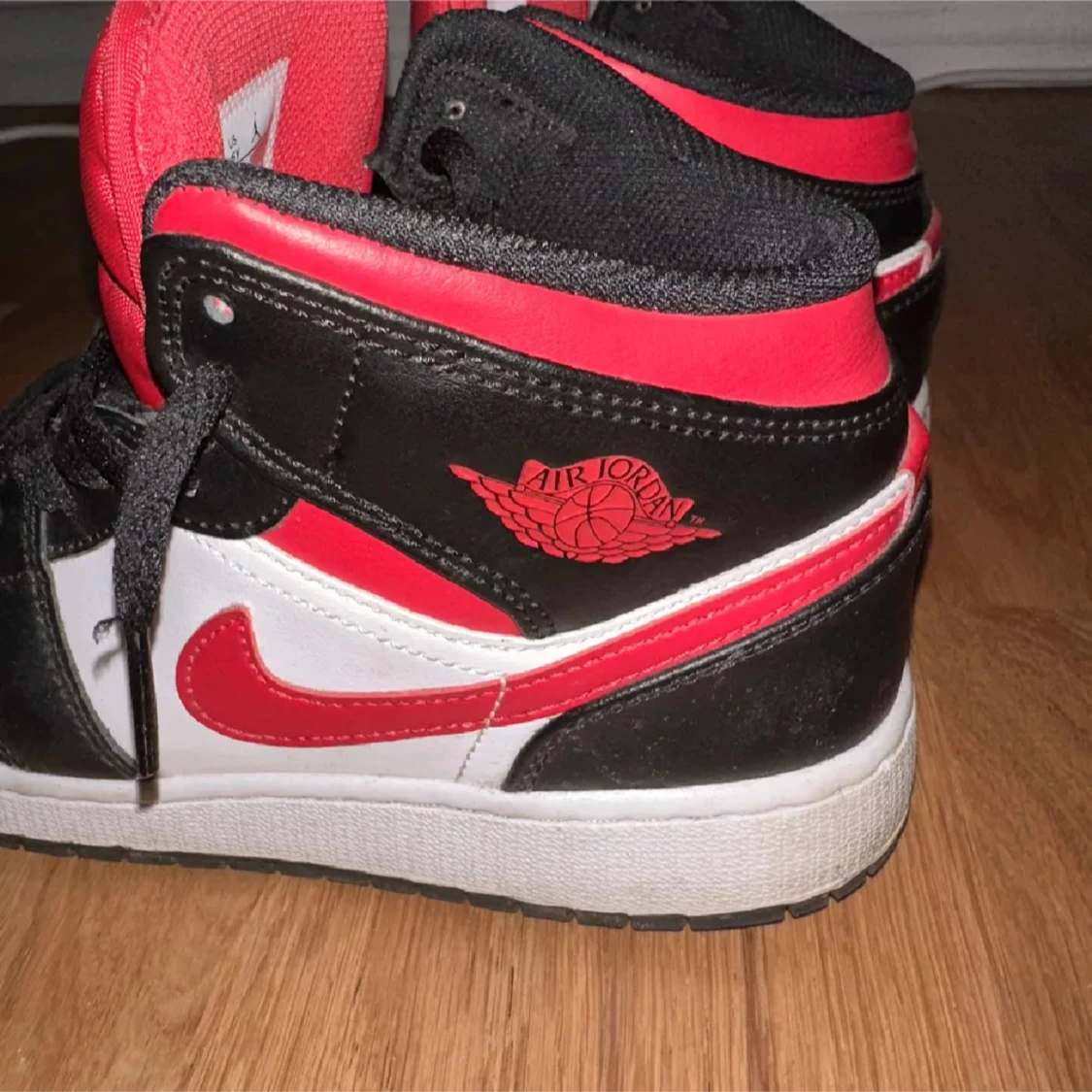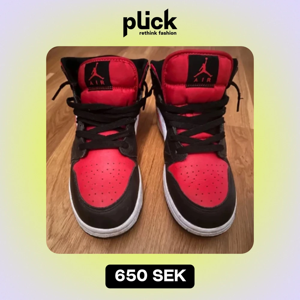 Säljer ett par snygga Nike Air Jordans i svart och rött. De har en klassisk design med svart snörning och den ikoniska Air Jordan-loggan på sidan. Skorna är i bra skick och perfekta för både vardag och fest. Passar dig som vill ha en stilren och sportig look!