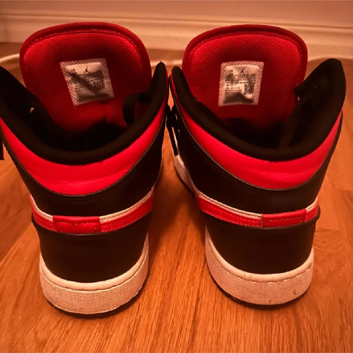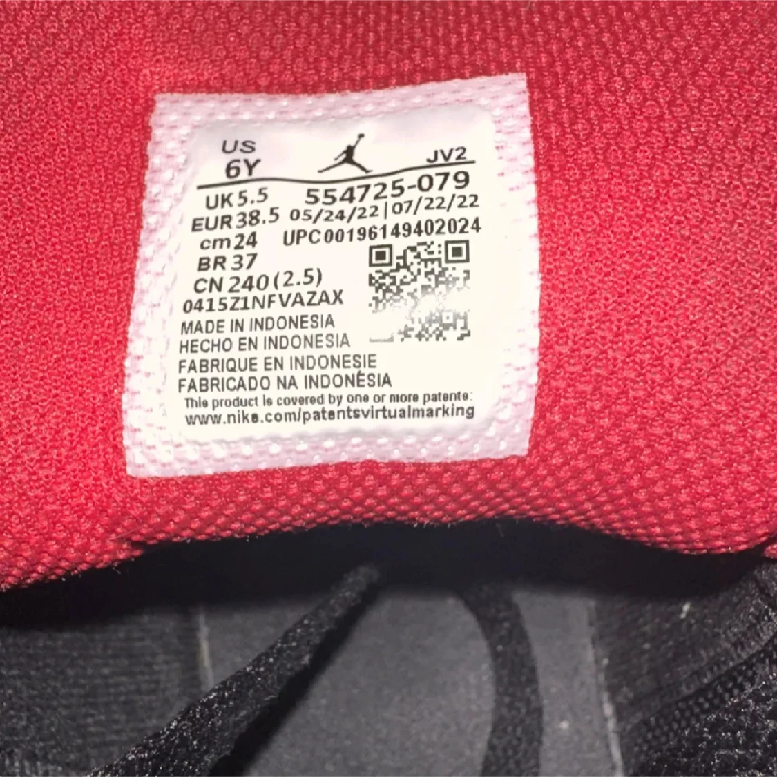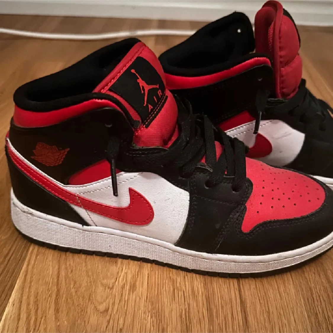 Säljer ett par snygga Nike Air Jordans i svart och rött. De har en klassisk design med svart snörning och den ikoniska Air Jordan-loggan på sidan. Skorna är i bra skick och perfekta för både vardag och fest. Passar dig som vill ha en stilren och sportig look!