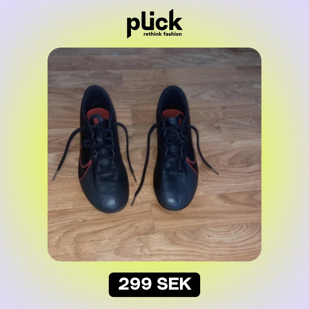 Säljer ett par svarta Nike fotbollsskor i storlek herr 42. Skorna har röda detaljer och snörning. De är i bra skick och perfekta för fotbollsträning eller match.
