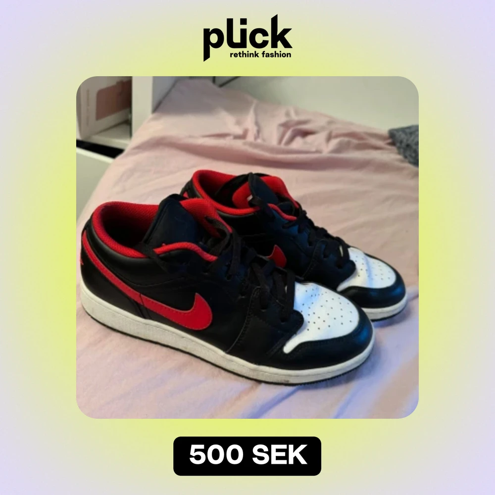 Säljer ett par snygga Nike Air Jordans i svart, röd och vit. Skorna har en klassisk design med svart läder och röda detaljer, inklusive den ikoniska swoosh-loggan. De har en vit tåbox med perforeringar för extra ventilation. Perfekta för både vardag och fest!