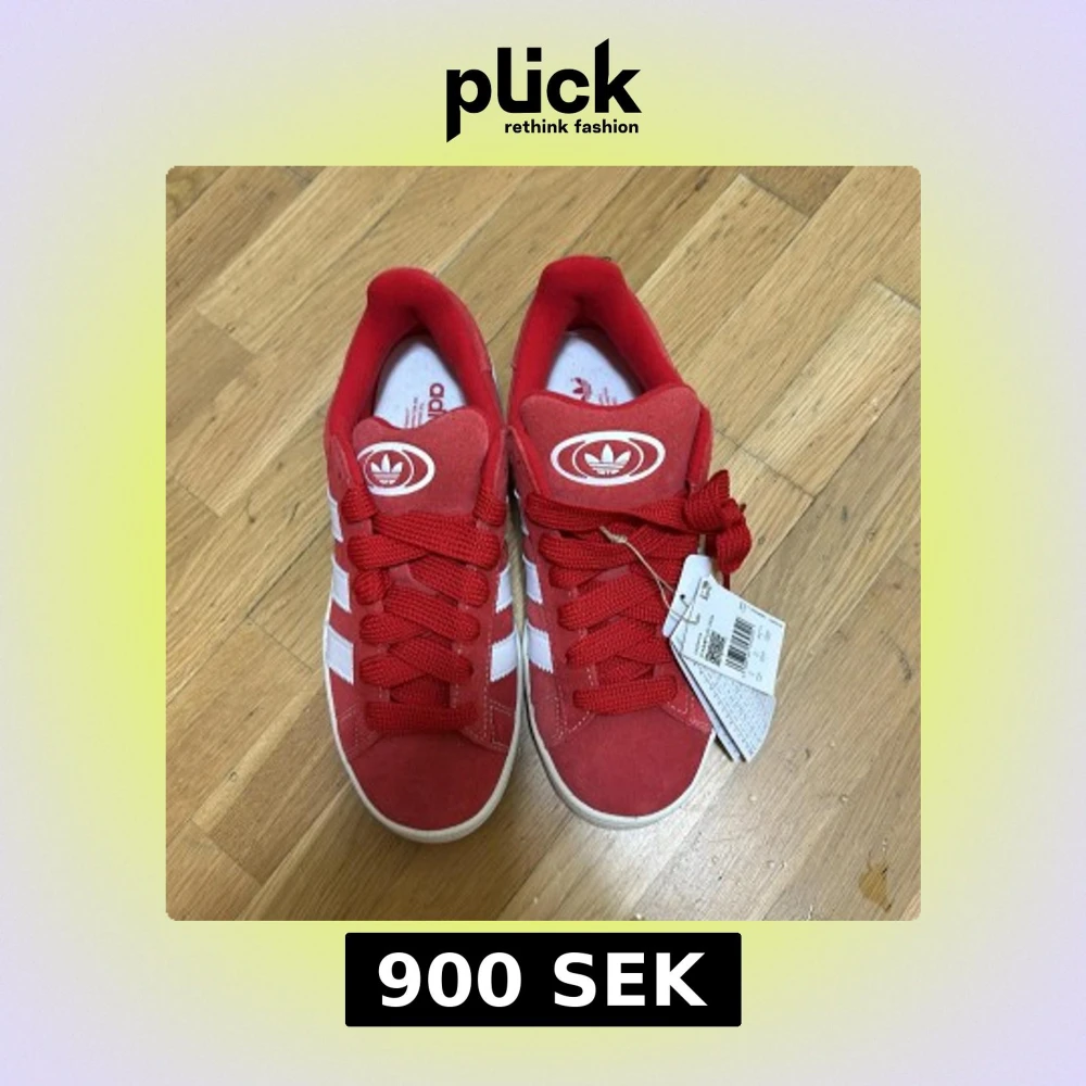 Snygga röda Adidas Campus sneakers med vita ränder och snörning. Perfekta för en sportig look. Skorna med en bekväm sula.