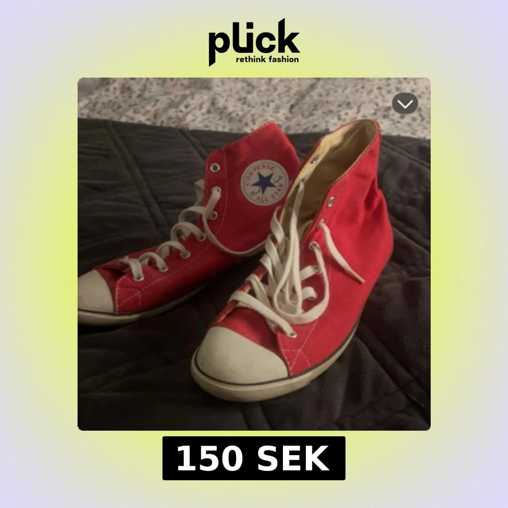 Säljer ett par klassiska röda Converse All Star sneakers med vita snören och rund tå. Perfekta för en avslappnad stil och passar till det mesta. Ikonisk logga på sidan, priset kan diskuteras.