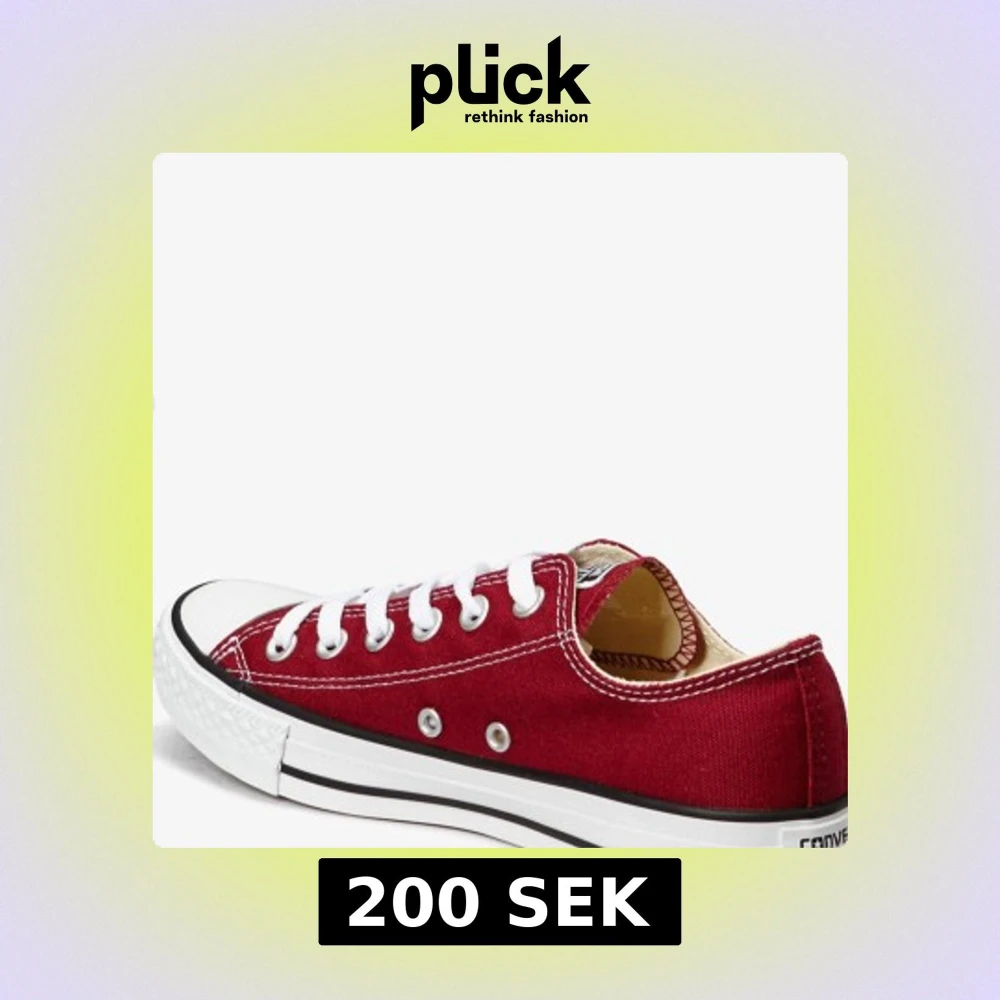 Klassiska röda Converse sneakers med vit tå och sula. Skorna har vit snörning, lågt skaft och tydliga kontrastsömmar. Tillverkade i canvas med gummisula och rund tå. Perfekta för dig som gillar en tidlös och avslappnad stil. Köpte för en tag sen och lite slitna, se bild 3/4.