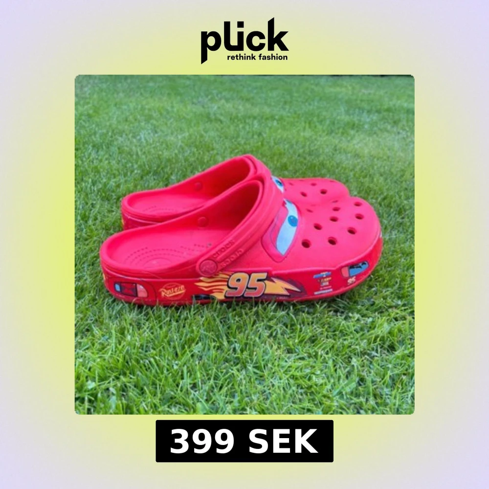 OBS!! Bandens har tyvärr försvunnit på crocsen men är fortfarande lika snygga och snabba Säljer ett par röda Crocs med Blixten McQueen från Disney Cars. Skorna har öppen tå, platt sula och coola detaljer som ögon och nummer 95 på sidorna. Perfekta för dig som gillar färgglada och lekfulla skor!