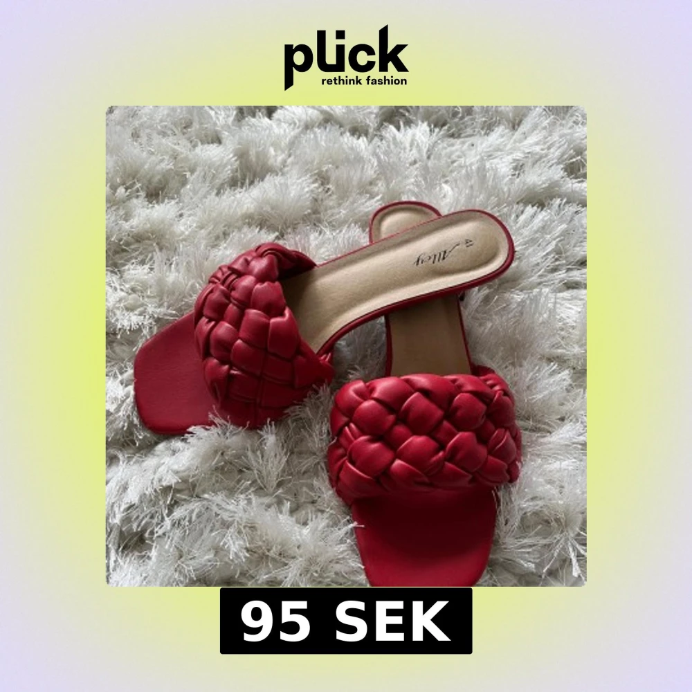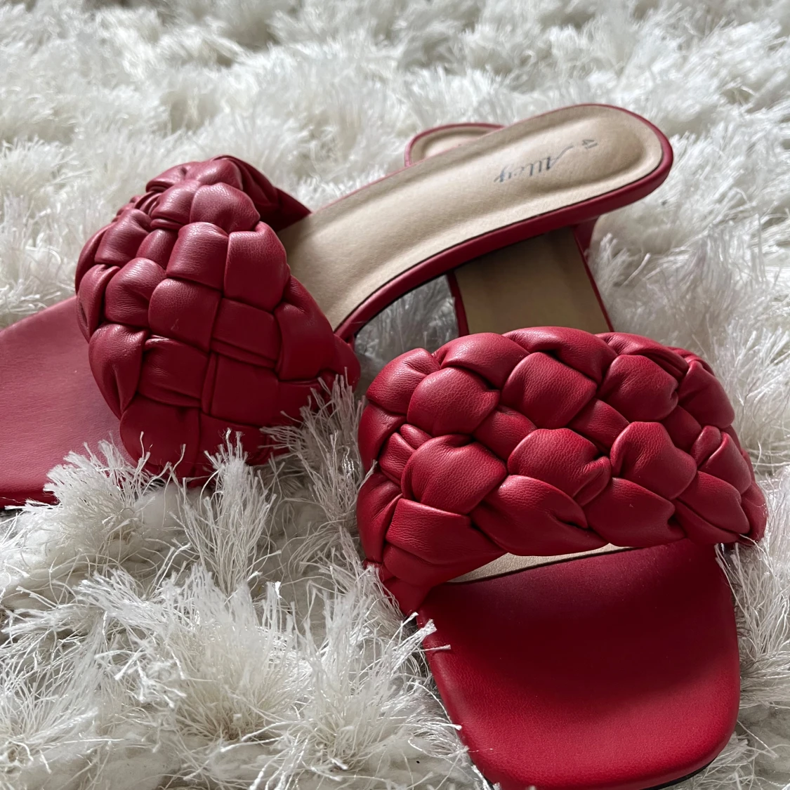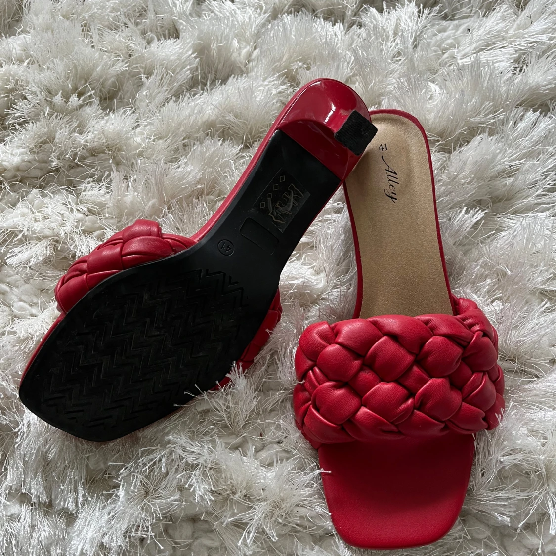 Säljer ett par röda sandaler från Alley med bred, flätad rem över foten och fyrkantig tå. Snygg design med platt sula och mjukt material som ger en cool vibe till din outfit. Perfekt för dig som gillar att sticka ut med färg och detaljer.