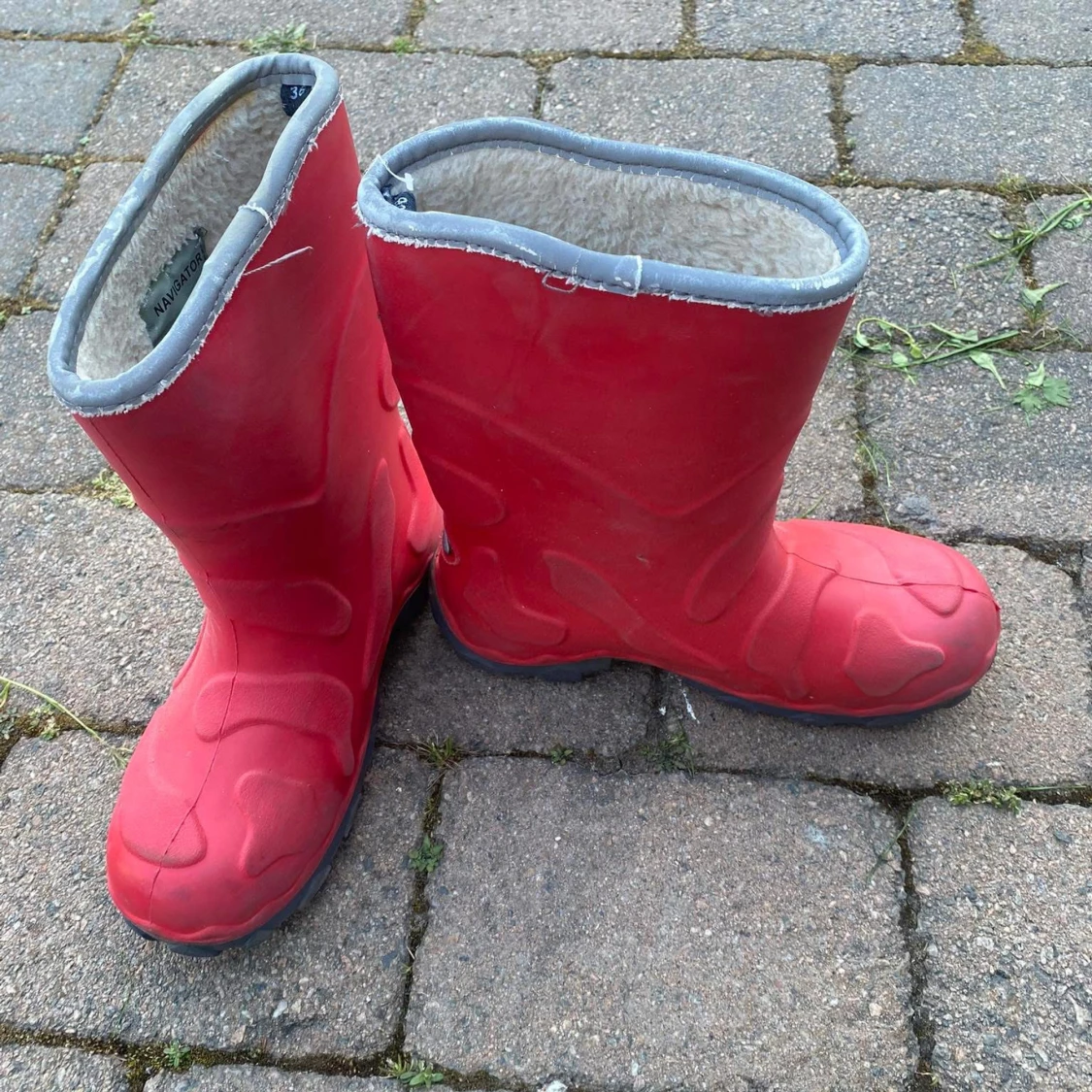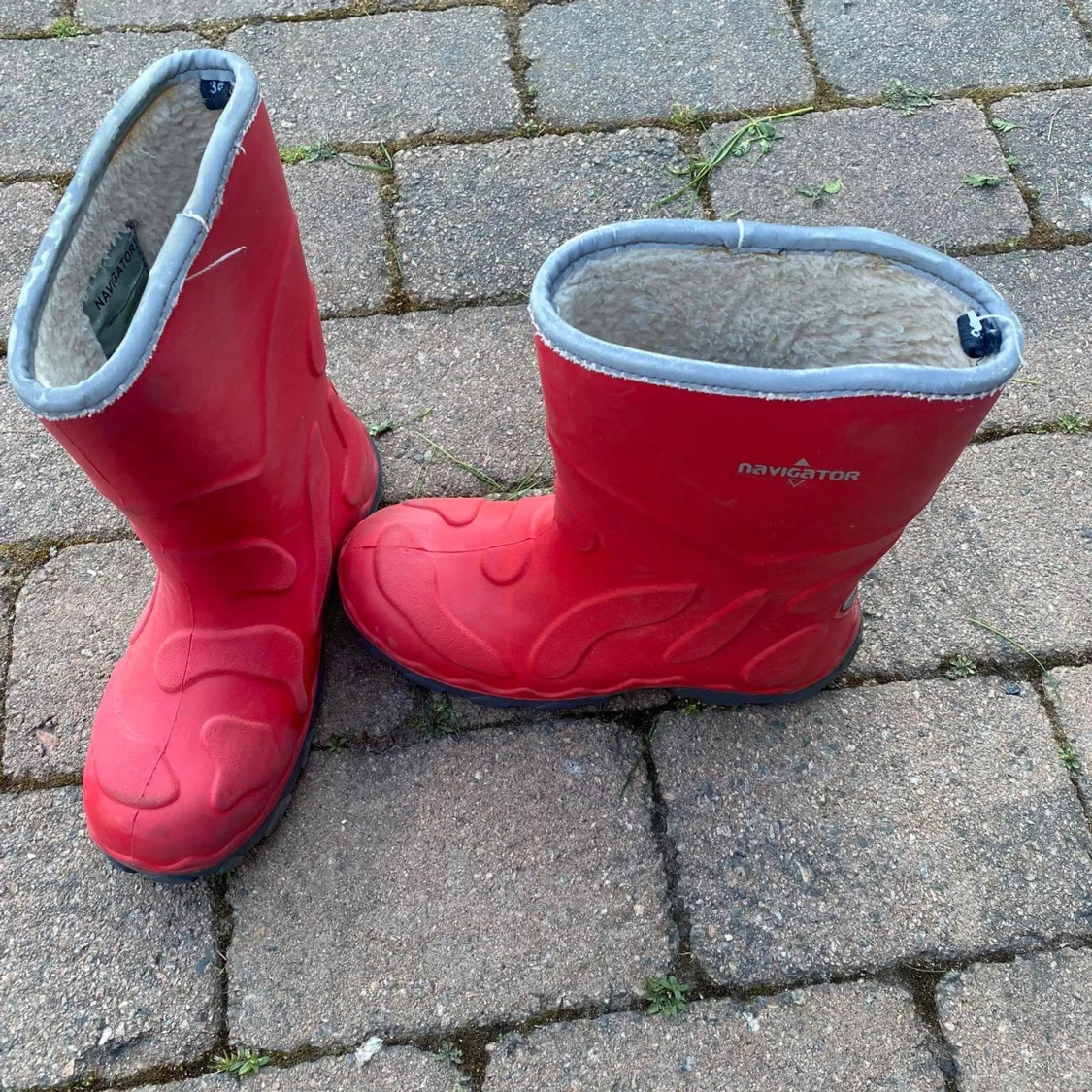 Säljer ett par röda stövlar från Navigator med grå kant och mjukt foder på insidan. Stövlarna har en cool, mönstrad yta och är perfekta för kalla och blöta dagar. Sula i svart och rund tå för skön passform.