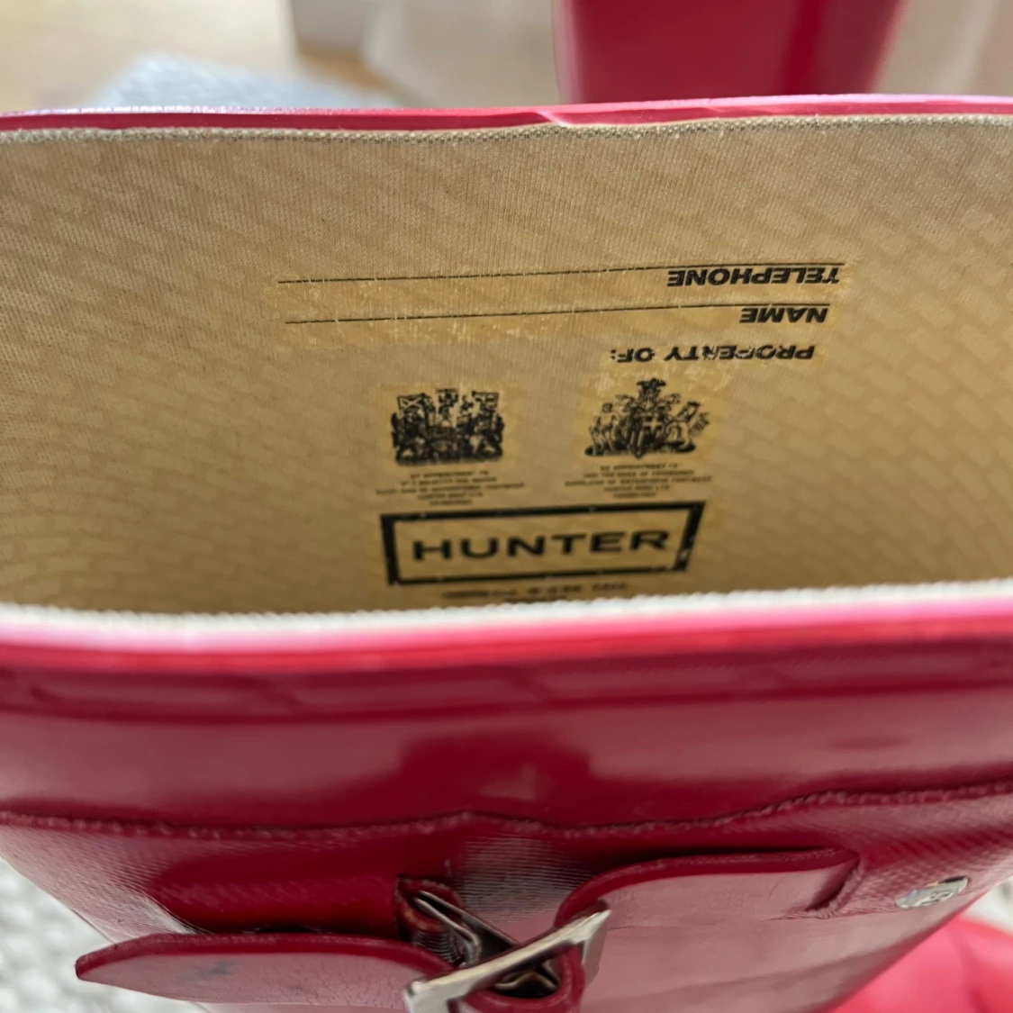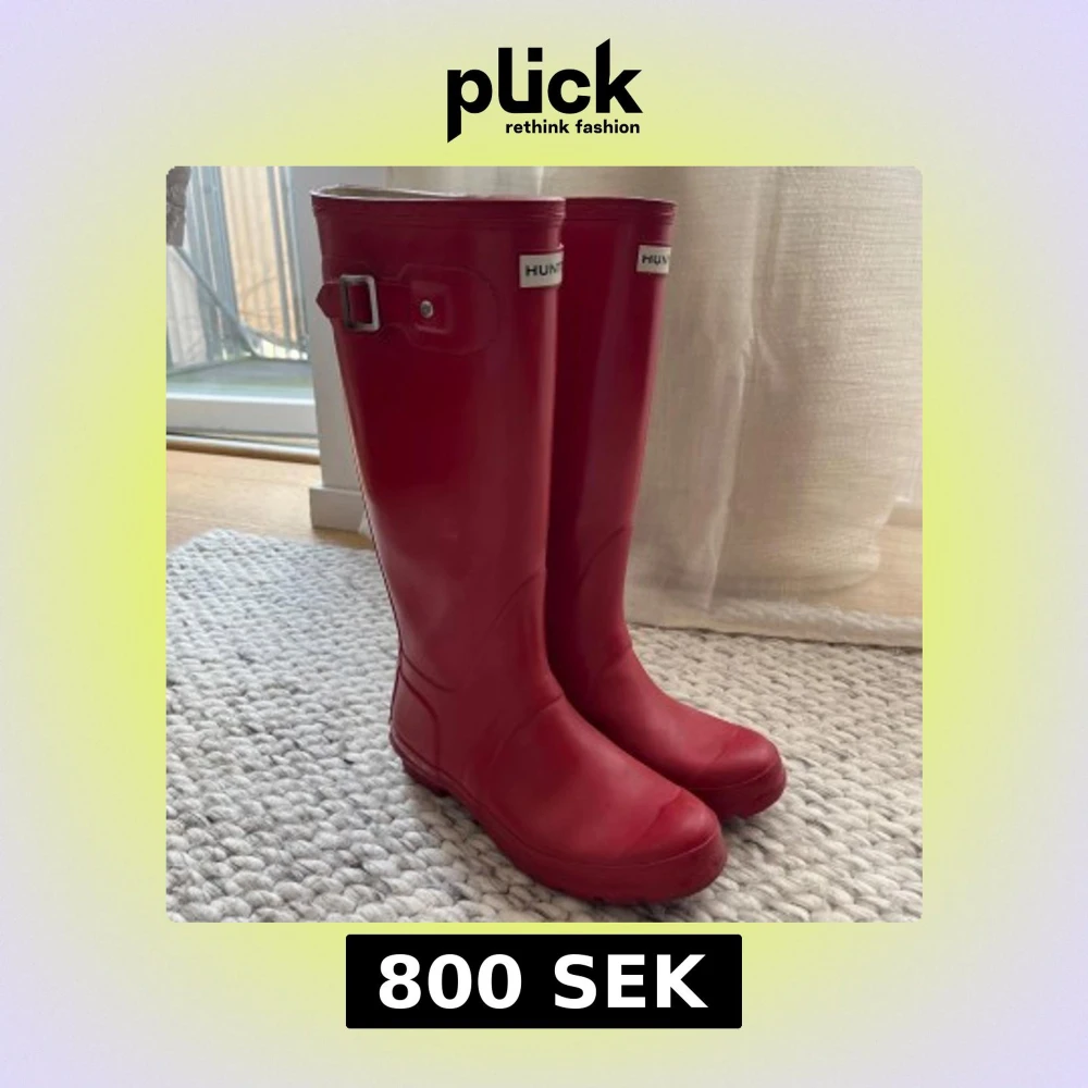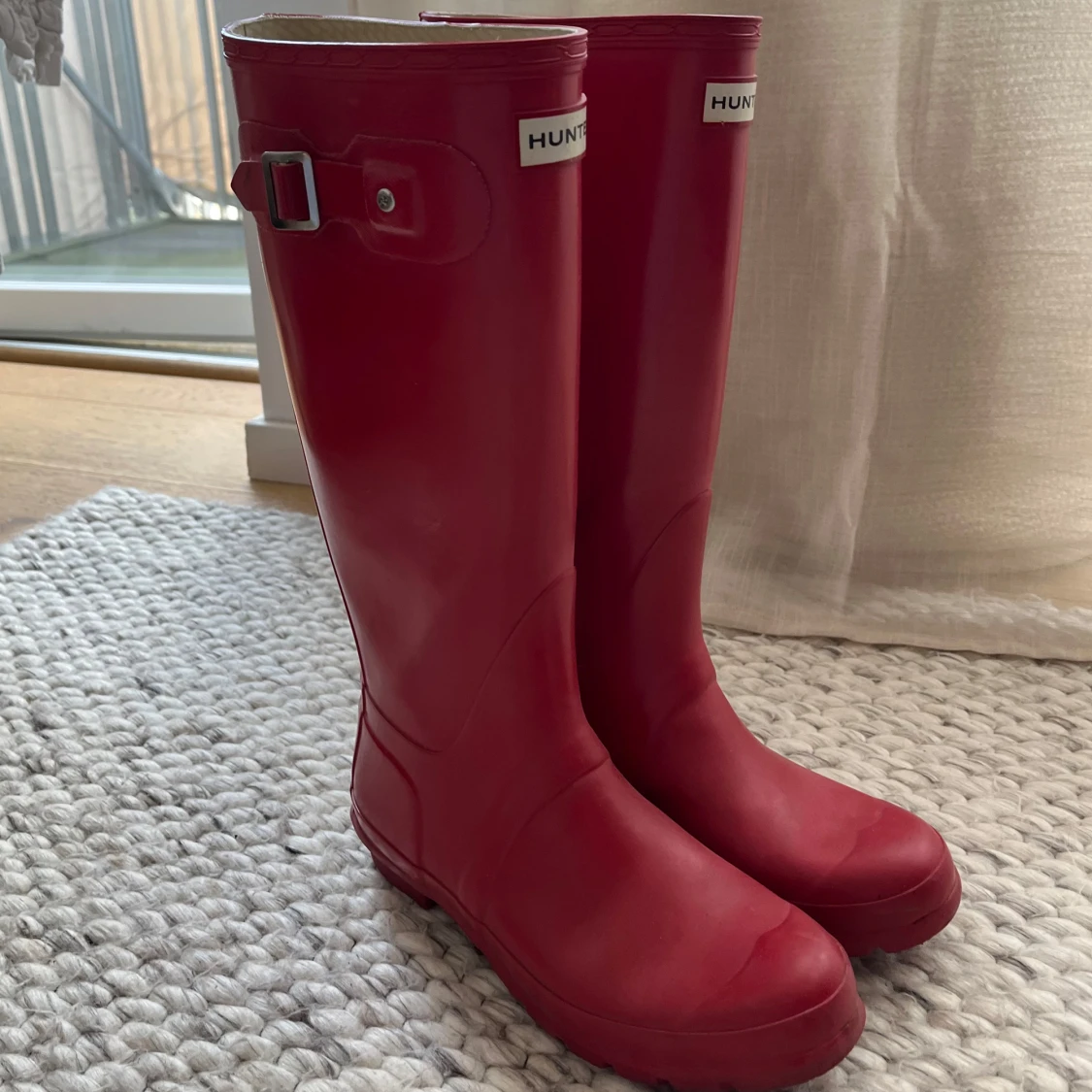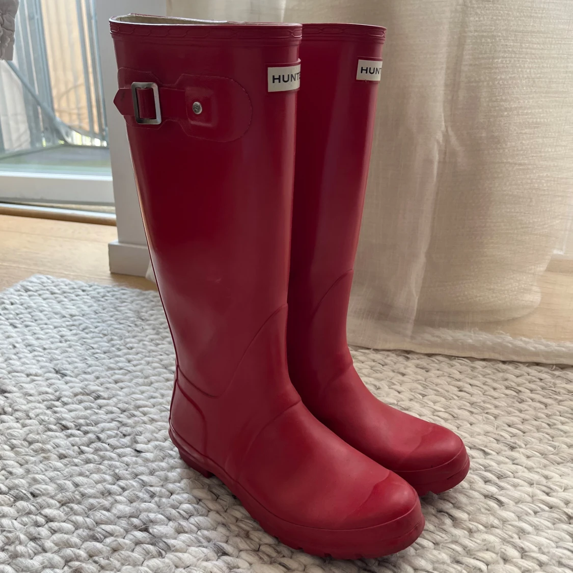 Röda hunter stövlar, med spänne, storlek 38. I fint skick! Slitstarkt gummi! Perfekt för regniga dagar