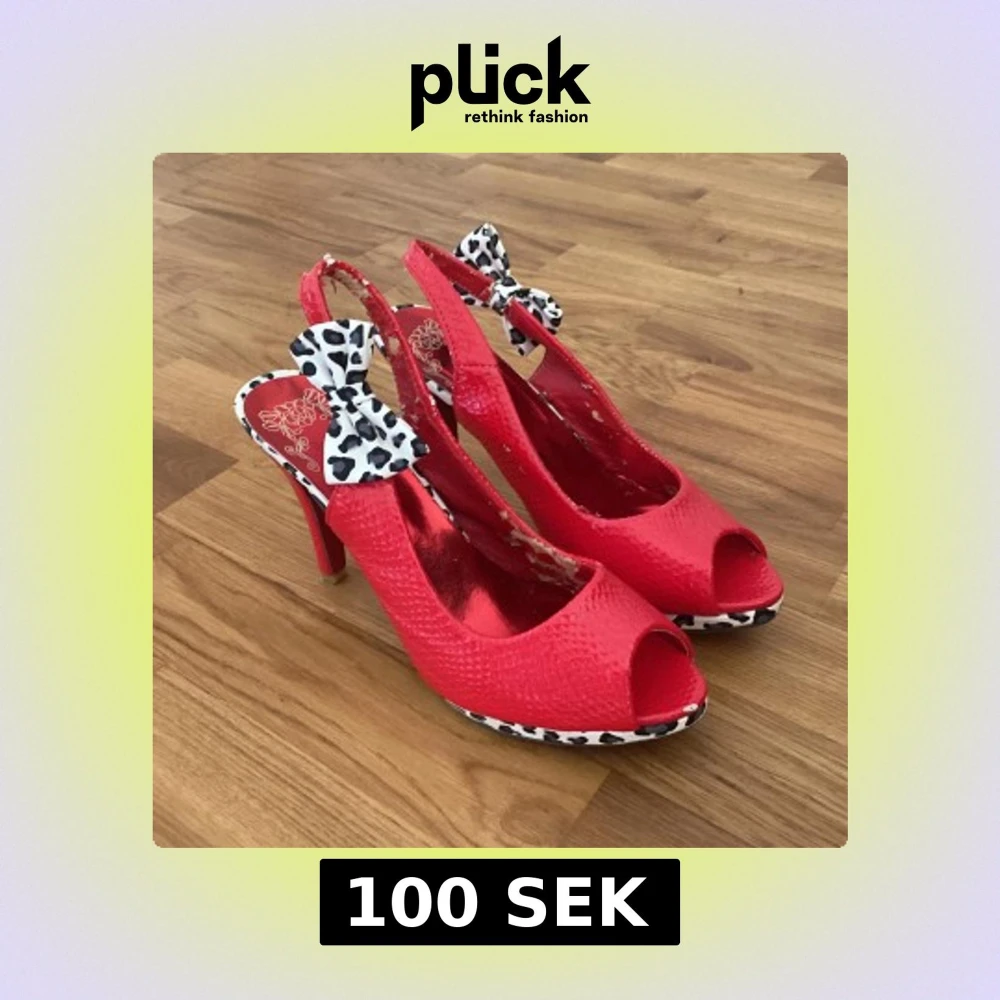 Röda pumps med öppen tå och hög klack. Skorna har leopardmönstrade detaljer och rosett.