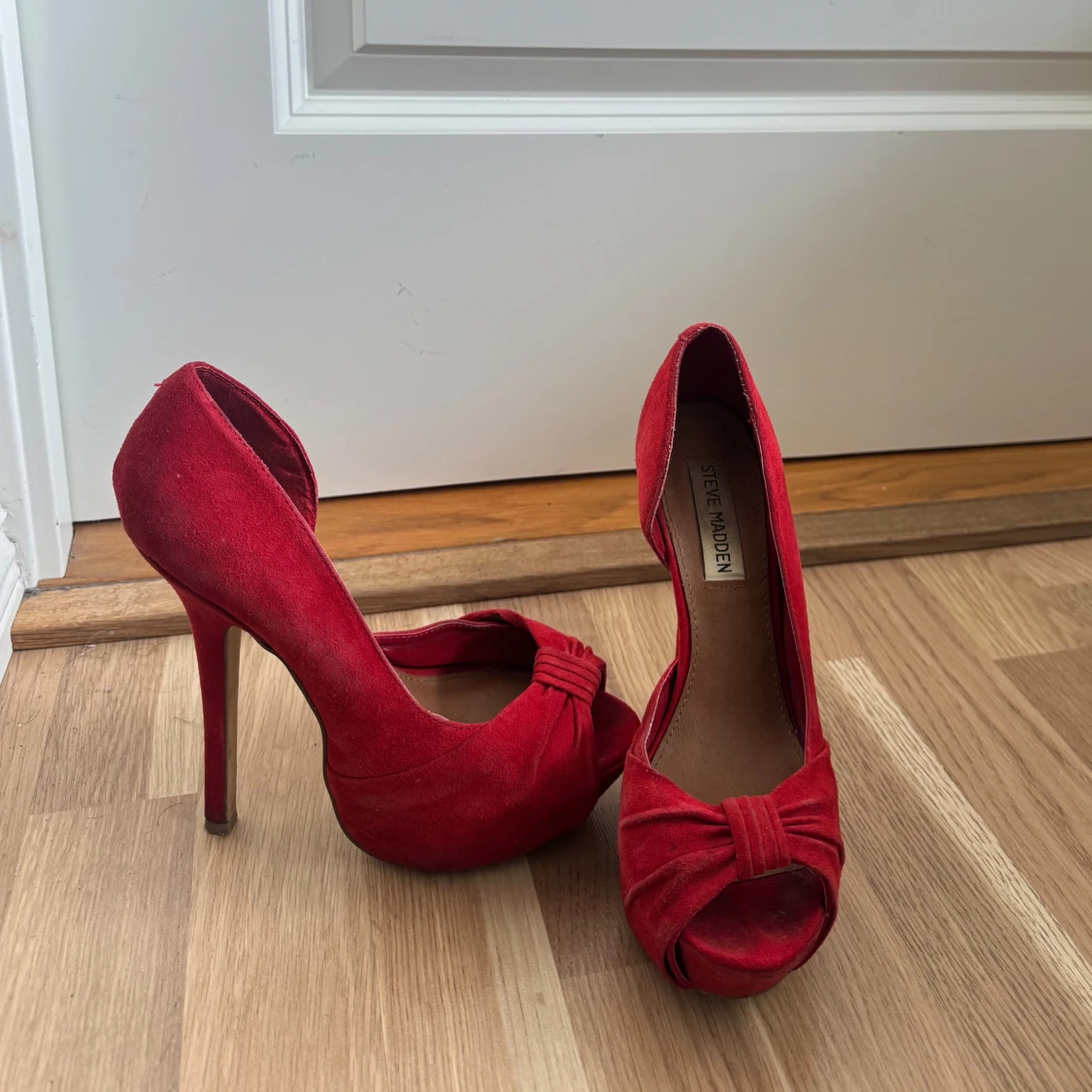 Snygga röda pumps i mocka från Steve Madden med hög klack och öppen tå. Skorna har en elegant knutdetalj framtill och en klassisk siluett som verkligen sticker ut.