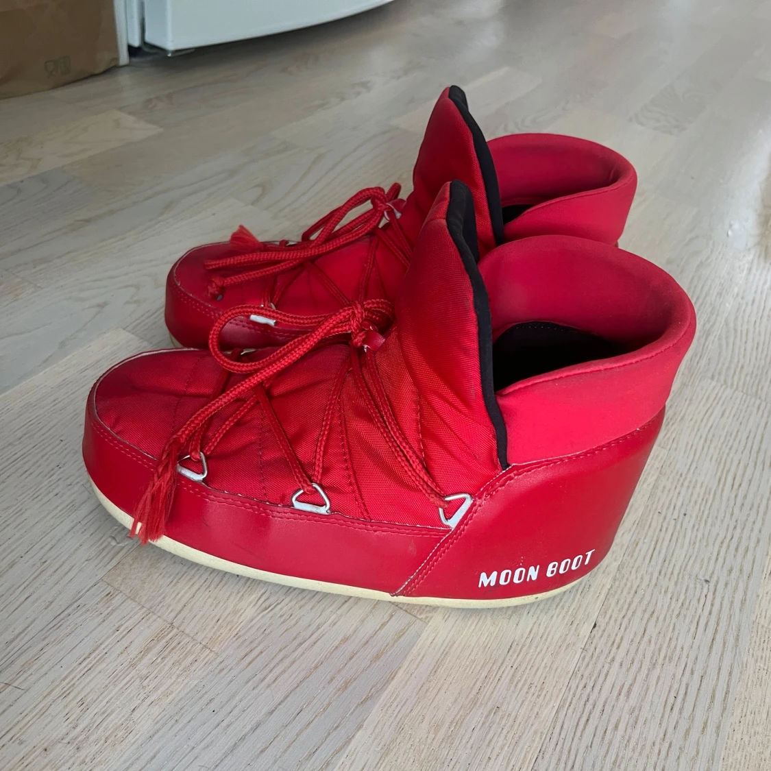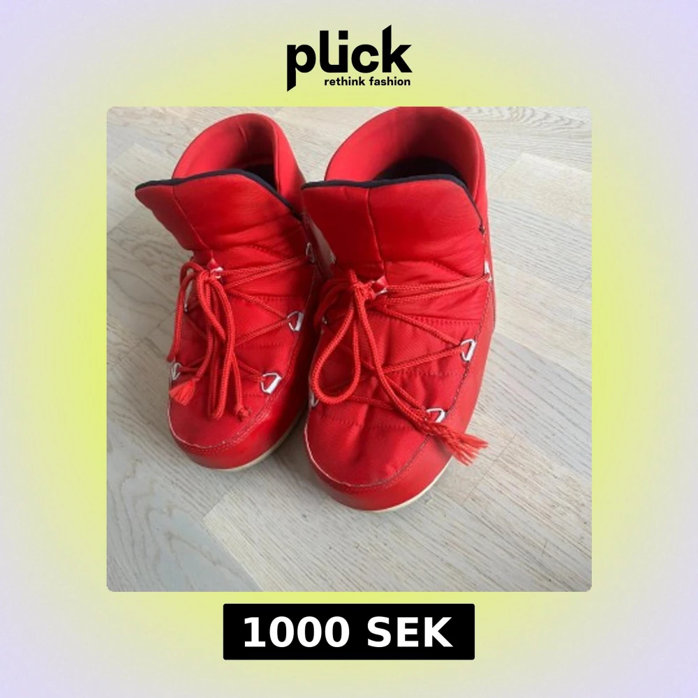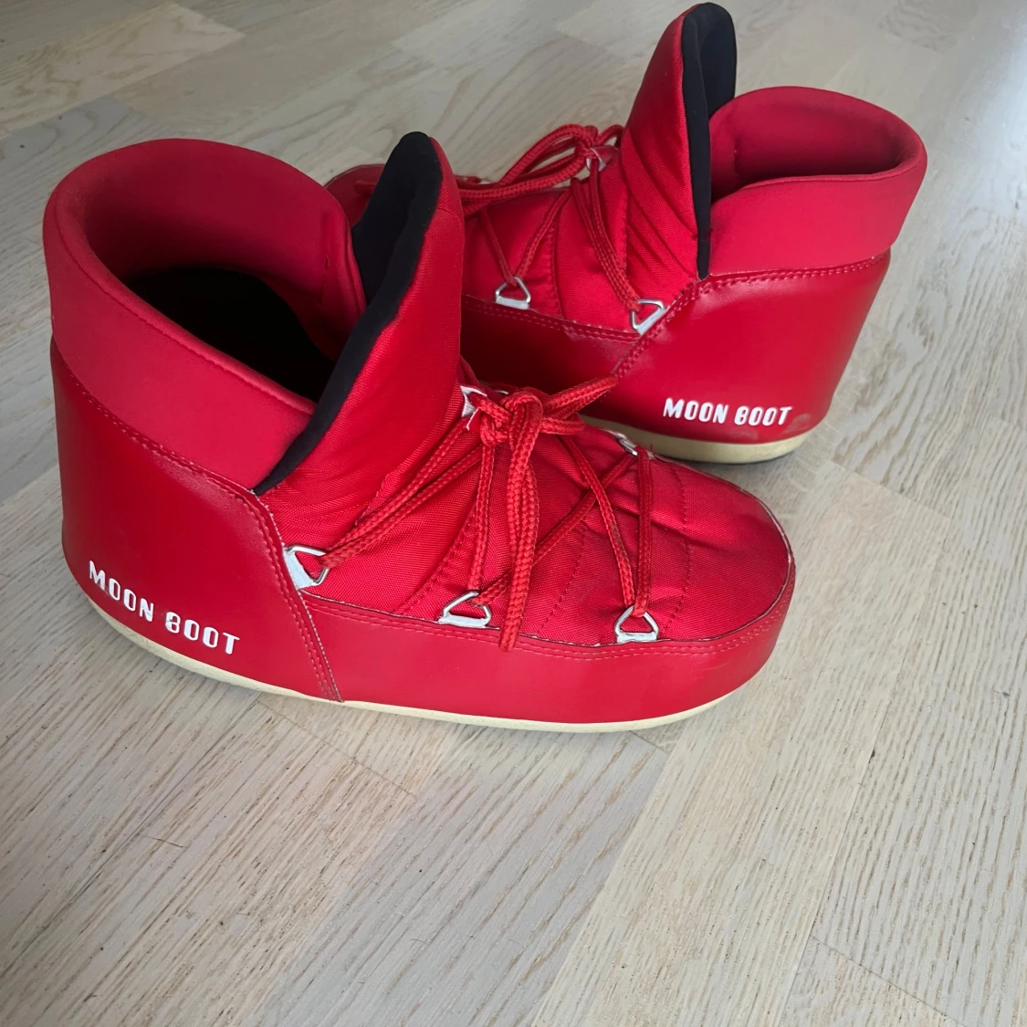 Snygga röda Moon Boots med snörning och vit sula. Perfekta för vintern med sin varma och vadderade design.
