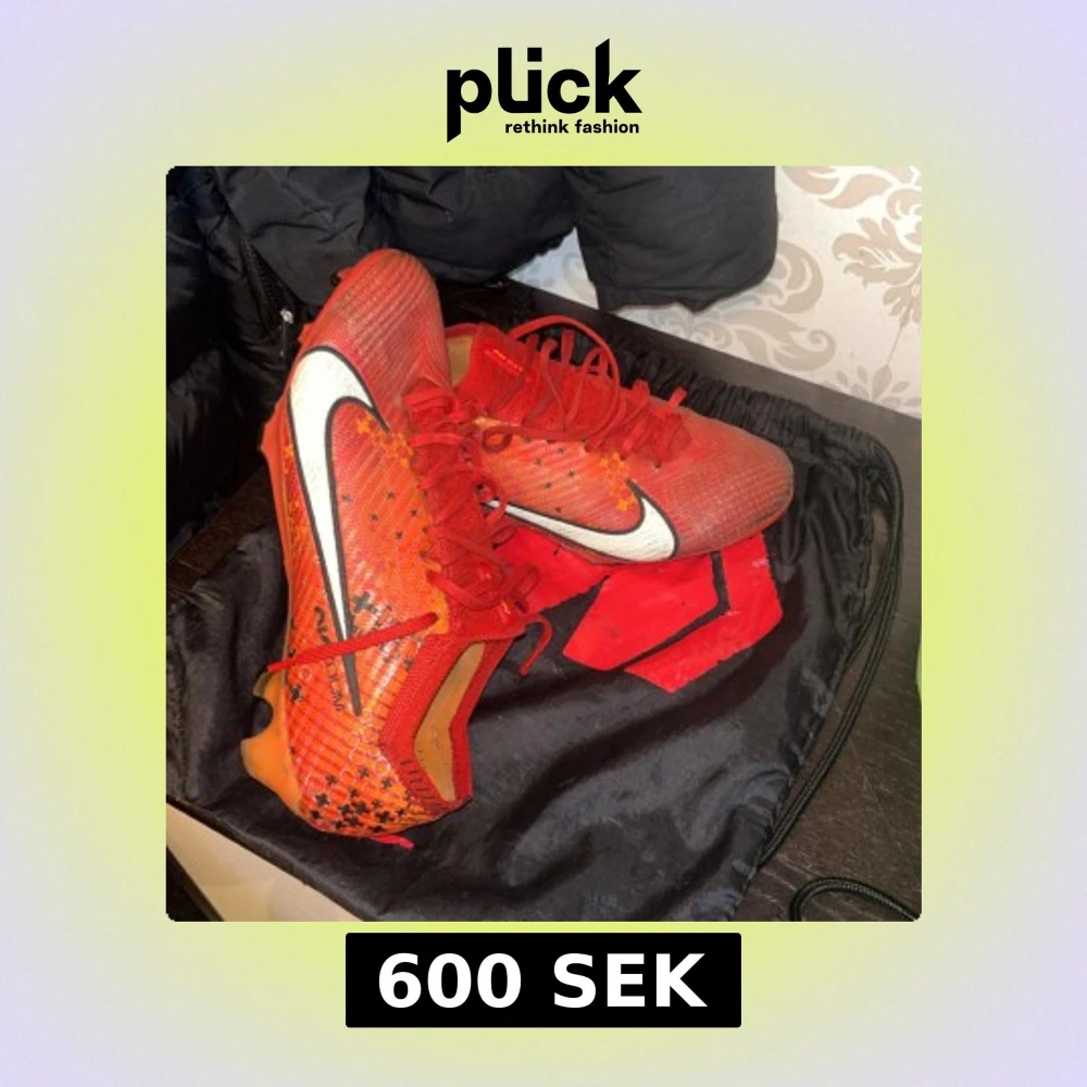 Säljer ett par röda Nike fotbollsskor med vit swoosh och svarta detaljer. Skorna har snörning och är tillverkade i syntetmaterial med mönstrad ovandel och plös. Perfekta för dig som vill sticka ut på planen! Och jag säljer dom på grund av att de är små för mig