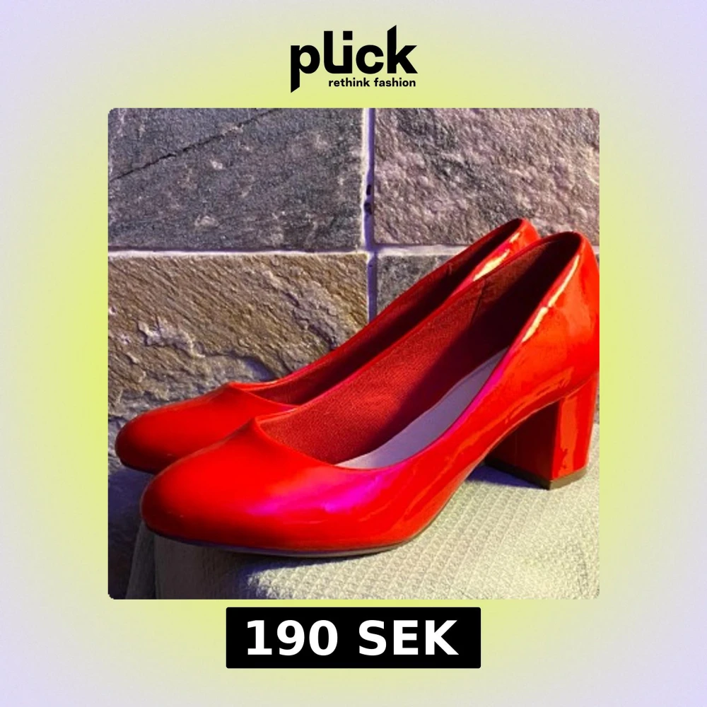 Snygga röda pumps från Bianco med rund tå och bred klack. Skorna har en glansig finish och är tillverkade i syntetmaterial. Perfekt för dig som vill sticka ut med färg och stil. Klacken är stabil och ger bra stöd.