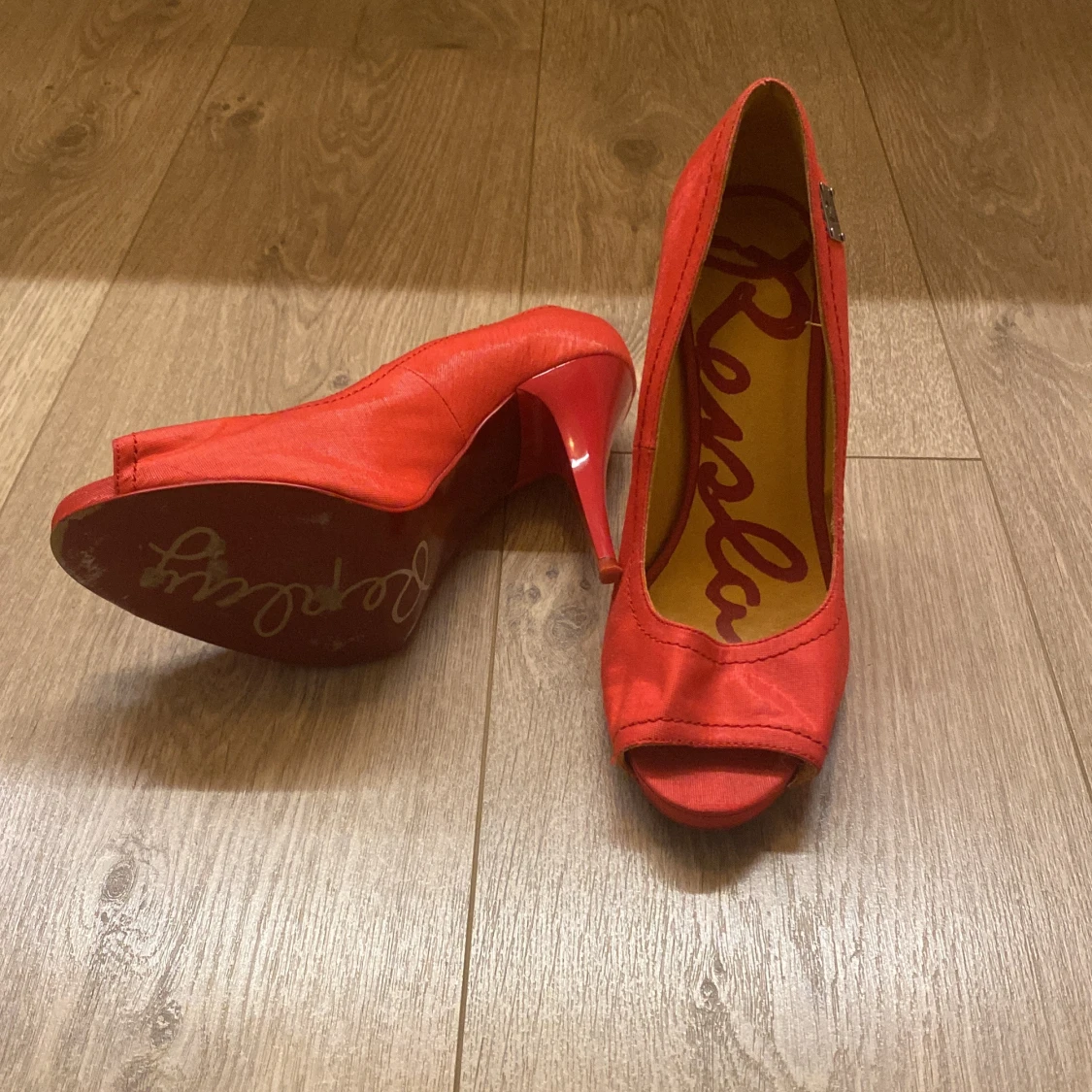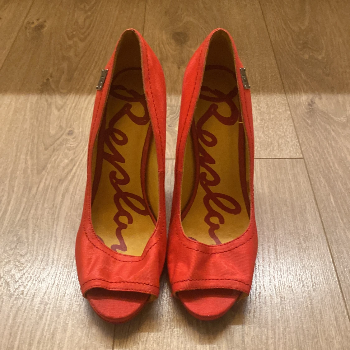 Snygga röda pumps från Replay med öppen tå och hög klack. Skorna har en rundad form framtill och är tillverkade i ett tygmaterial med en lätt glansig finish. Insidan har Replay-logga i kontrastfärg. Perfekta för dig som vill sticka ut med färg.