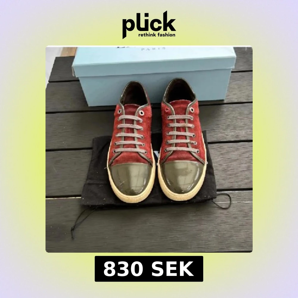 Snygga röda sneakers från Lanvin med en unik design. Skorna har en glansig grön tå och snörning framtill. Perfekta för att ge din outfit en stilfull touch.