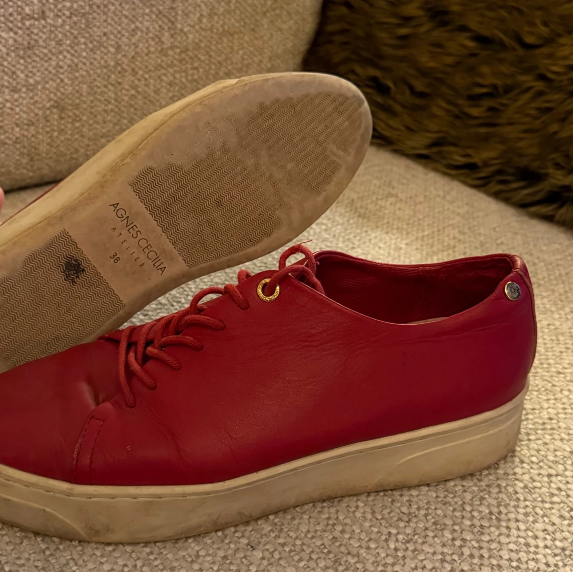 Snygga röda sneakers från Agnes Cecilia med platt vit sula och guldfärgade detaljer vid snörningen. Skorna är tillverkade i skinn och har en rund tå. Perfekt för dig som vill sticka ut med färg på fötterna och gillar stilrena detaljer.