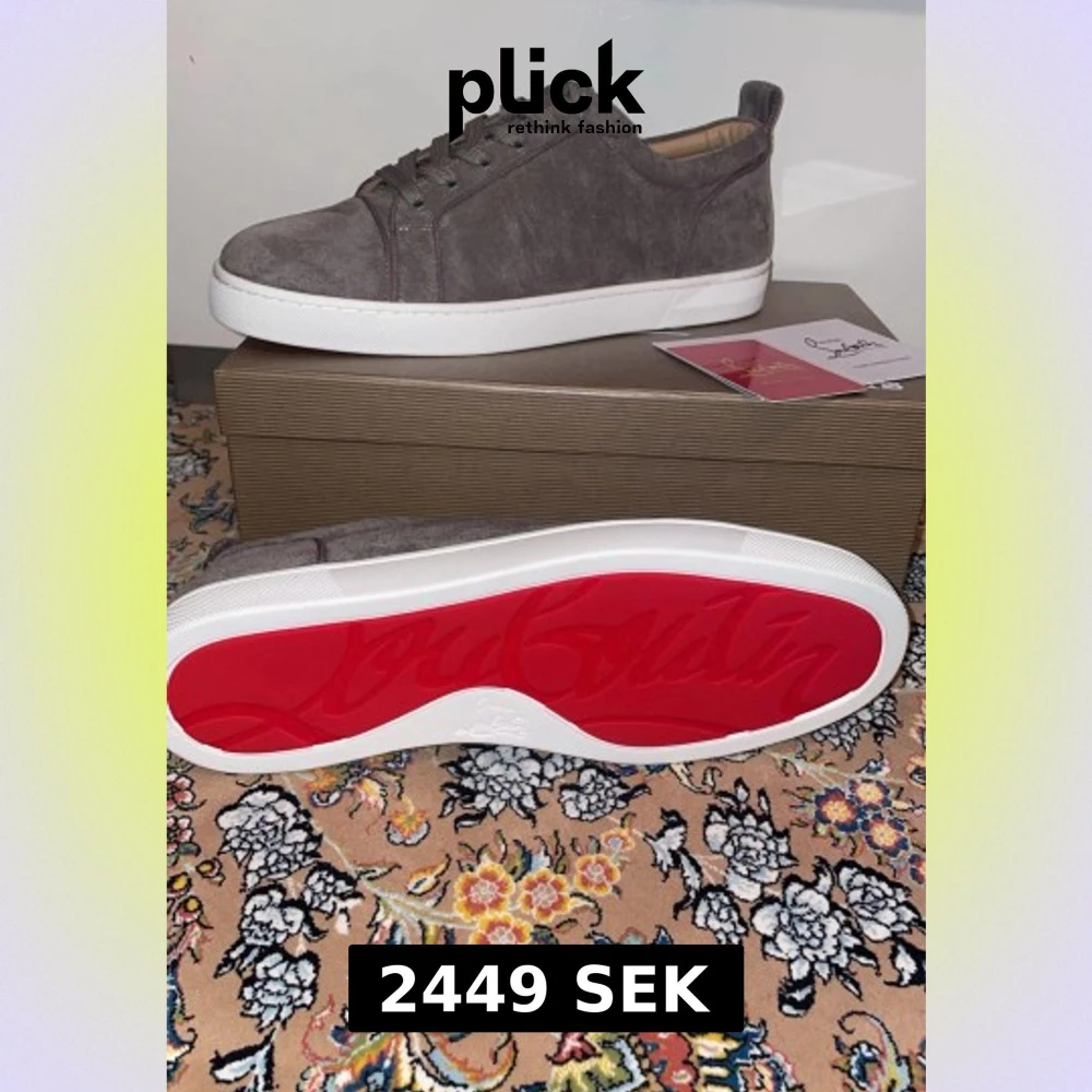Säljer ett par grå sneakers från Christian Louboutin i mjuk mocka med klassisk röd sula. Skorna har rund tå, snörning och vit platt sula. Perfekt för dig som vill ha en clean och lyxig look att ens försöka!