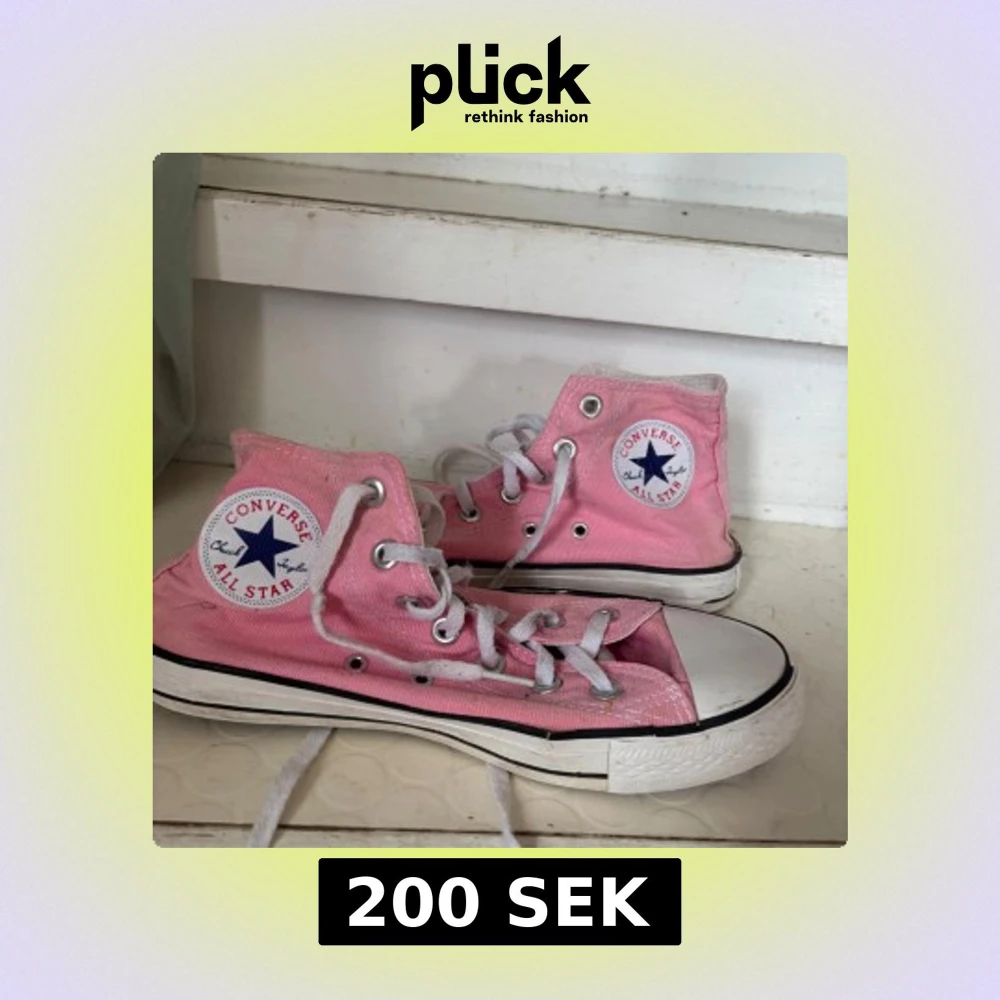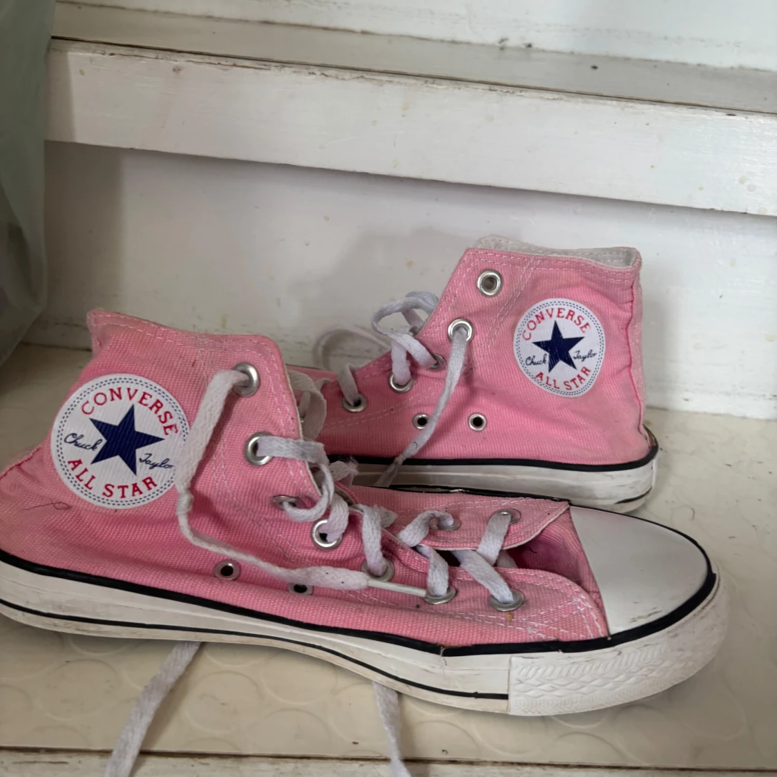 Klassiska Converse All Star sneakers i rosa canvas med vita snören och gummisula. Hög modell med rund tå och ikonisk logga på sidan. Perfekta för en avslappnad och cool stil.