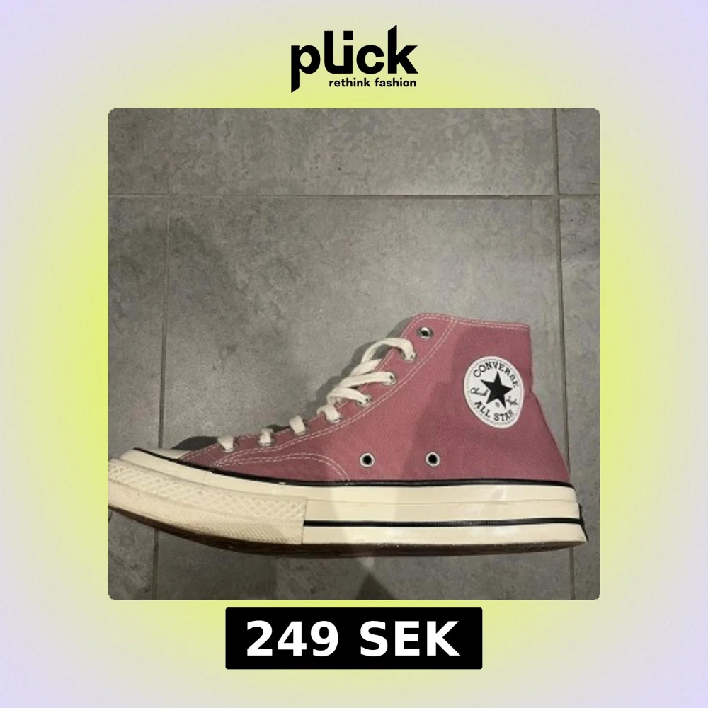 Säljer ett par klassiska Converse Chuck Taylor All Star i en snygg rosa färg. Skorna är höga med vit tåhätta, vita snören och sula med svarta detaljer. Tillverkade i canvas med Converse-logga på sidan. Perfekta för dig som vill ha en ikonisk och stilren sneaker.