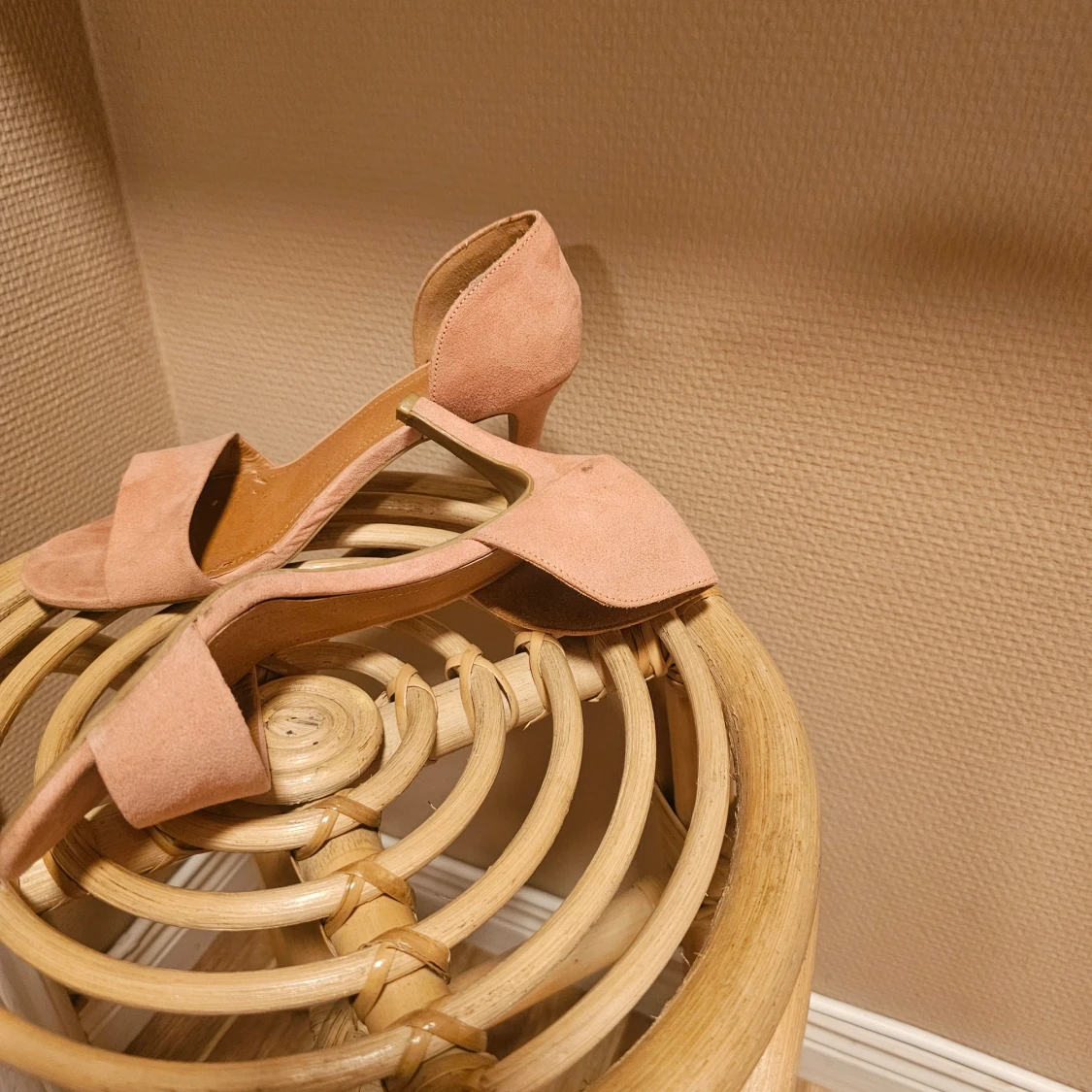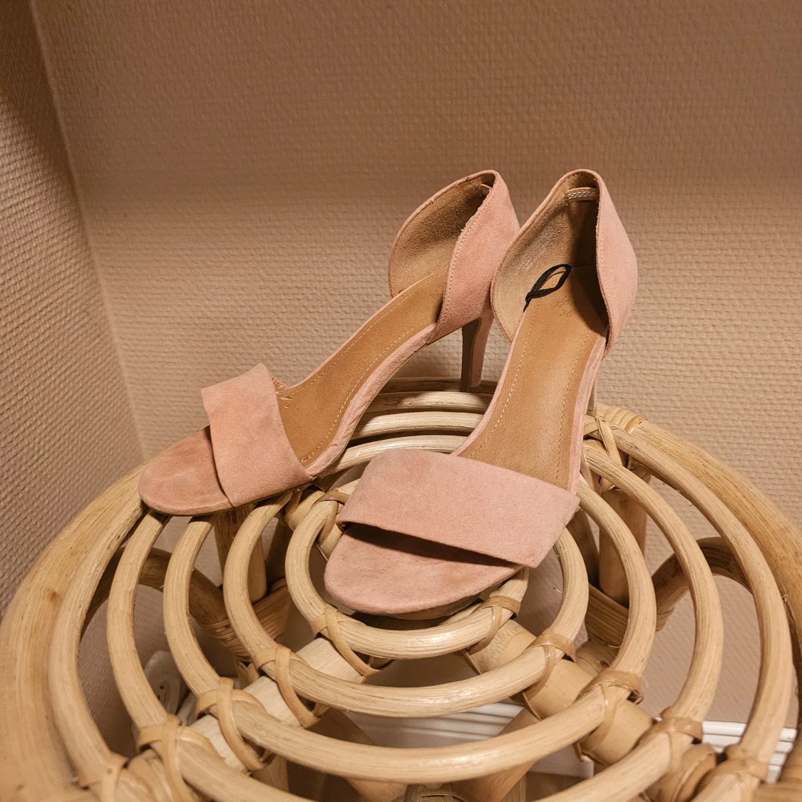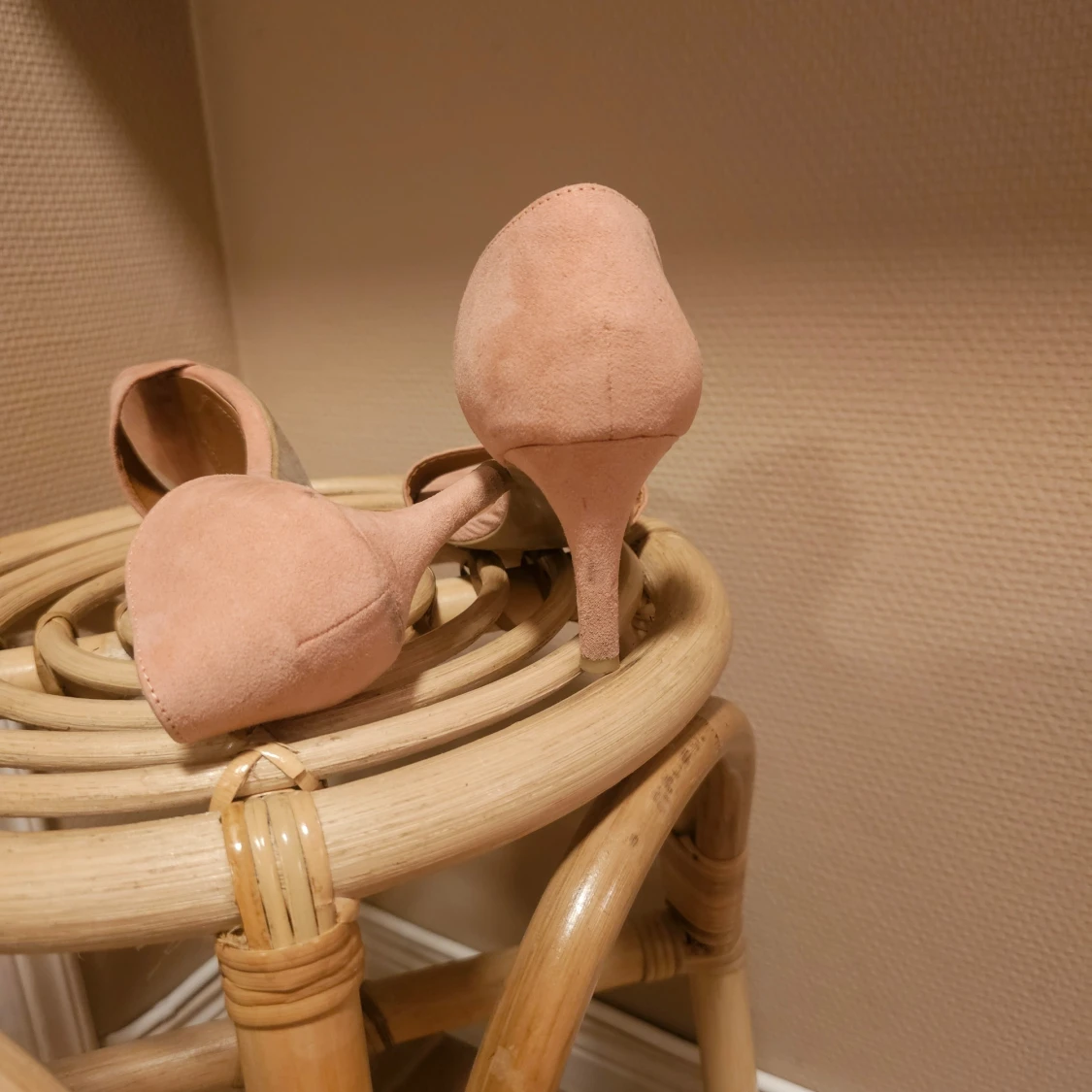 Snygga rosa klackskor i imitationsmocka med öppen tå och smal klack. Perfekta för en elegant look.