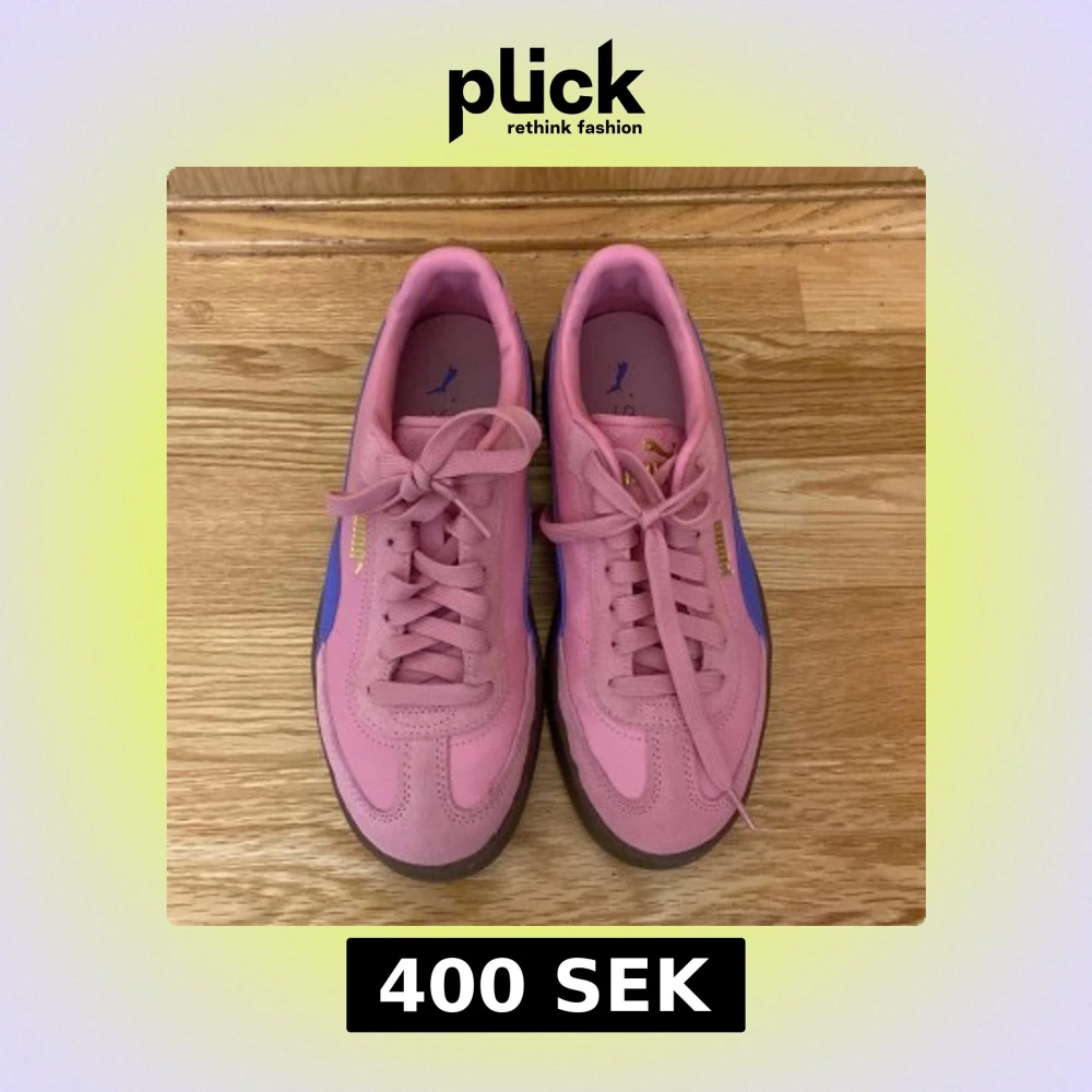 Säljer ett par snygga sneakers från Puma i rosa mocka med lila detaljer och gummisula. Skorna har klassisk snörning och guldfärgad Puma-logga på sidan. Perfekta för dig som vill sticka ut med färg på fötterna! Andvända inne bara cirka 5 gånger, pris kan diskuteras
