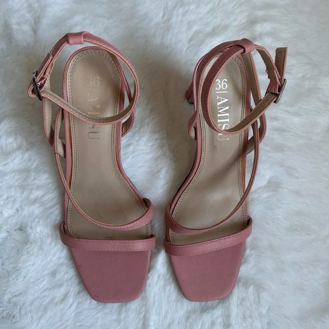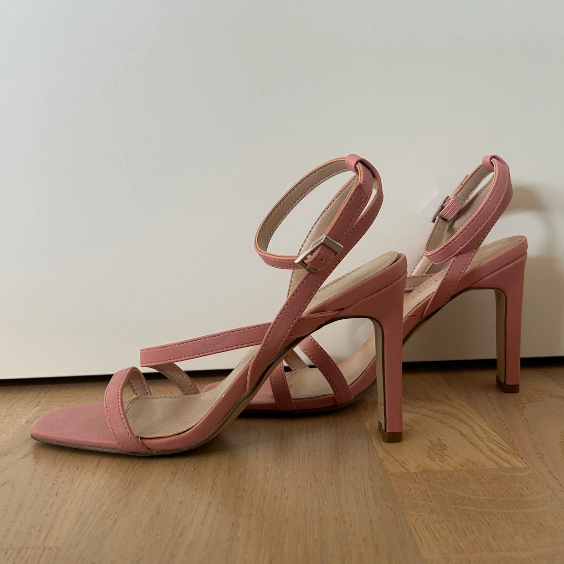 Säljer ett par stilrena rosa sandaler från Amisu med hög klack och smala remmar över foten och runt vristen. Skorna har fyrkantig tå och justerbart spänne vid ankeln. Perfekta för dig som vill ha en feminin och trendig look.