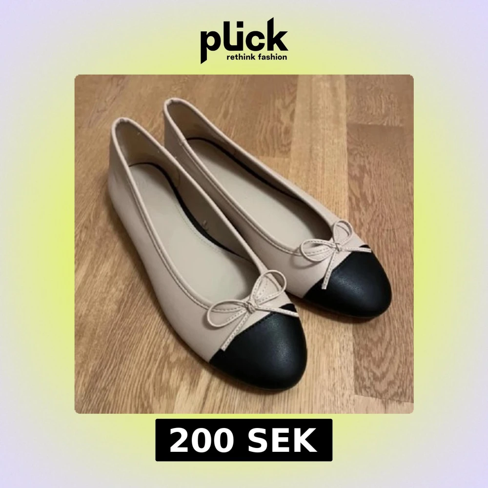 Snygga ballerinaskor i beige med svart tå och en söt rosett framtill. Perfekta för en stilren look. Säljer eftersom de va för stora, (inte min bild)💞
