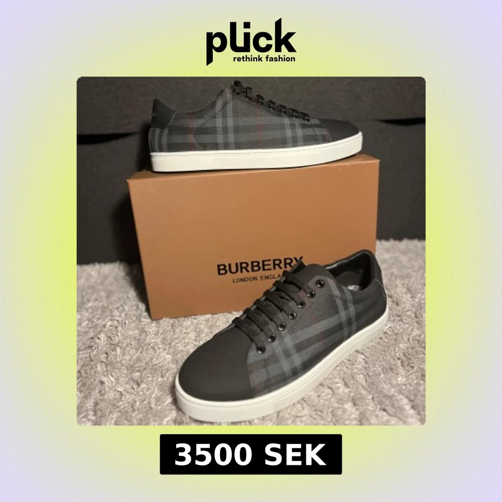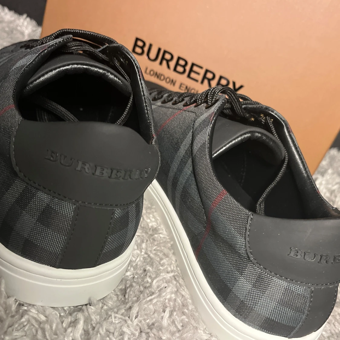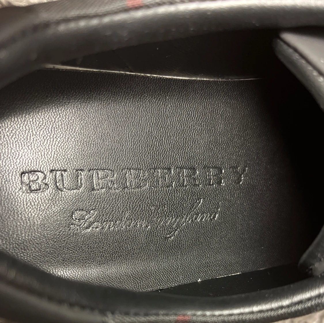Snygga sneakers från Burberry med klassiskt rutigt mönster i grått och svart. Skorna har en vit sula och svart snörning. Perfekta för en stilren look.