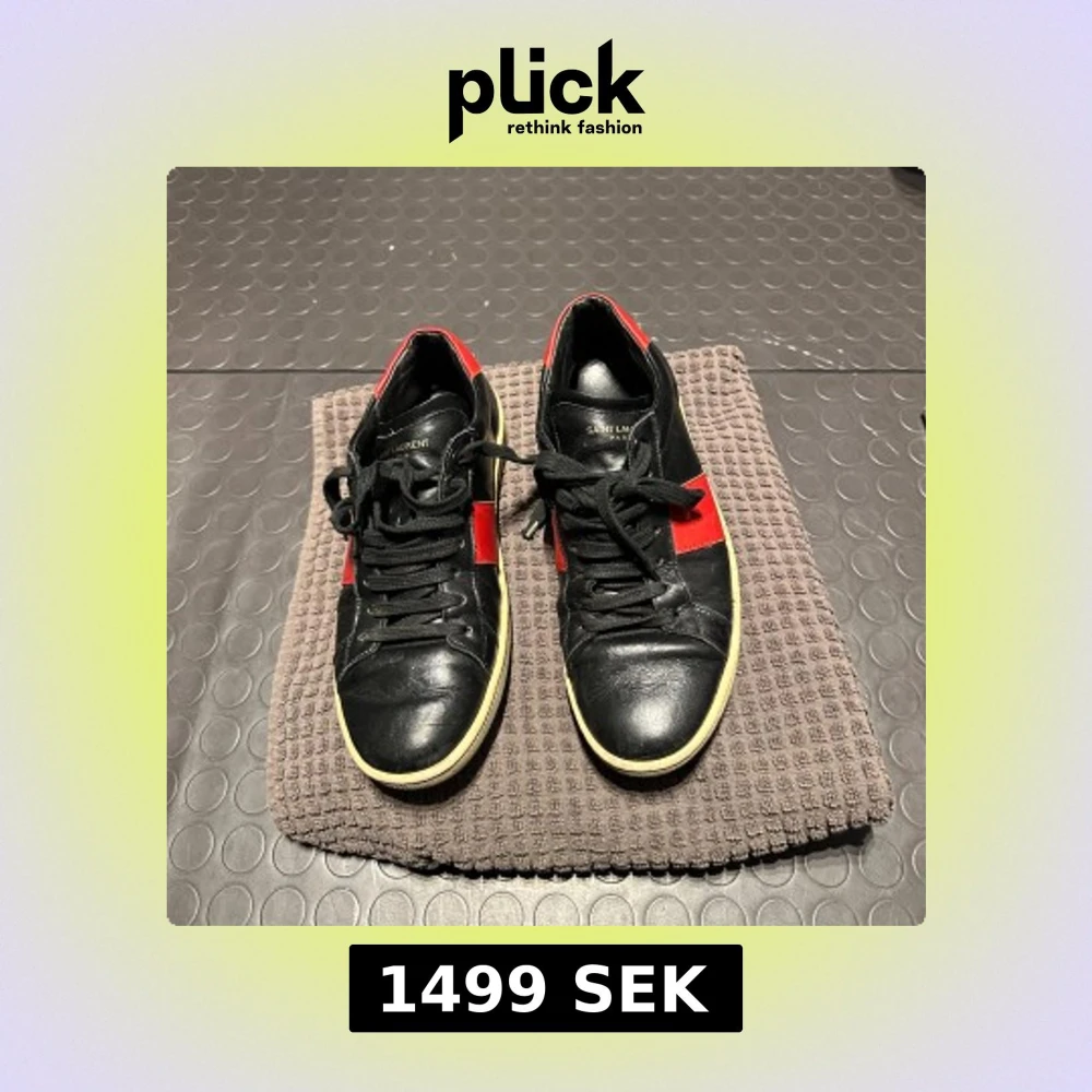 Snygga svarta sneakers med röda detaljer från Saint Laurent. Skorna har snörning och en klassisk design med en kontrasterande vit sula. Perfekta för en stilren look.