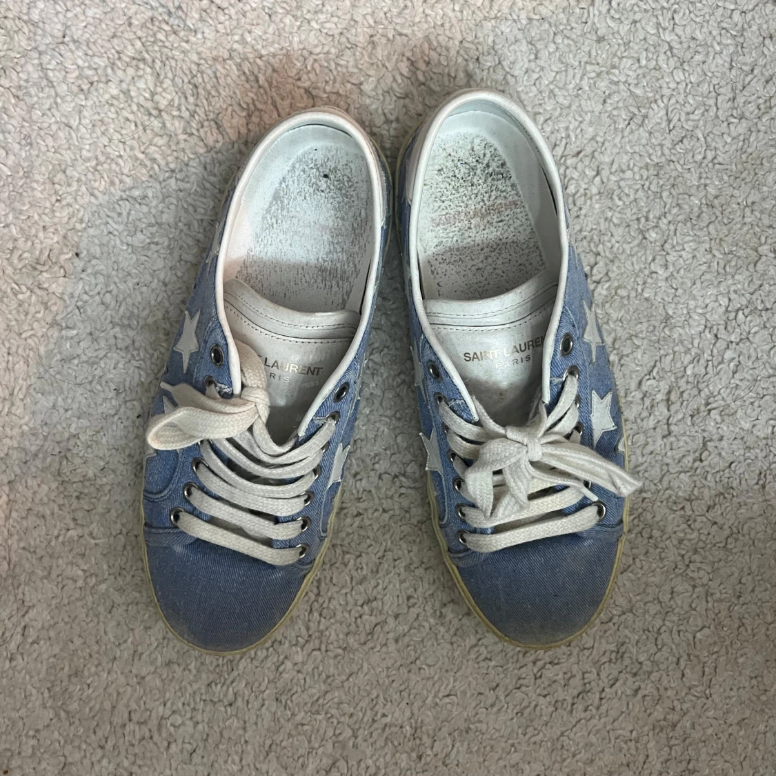 Snygga sneakers från Saint Laurent i ljusblå denim med vita stjärnor och vita skinn-detaljer. Skorna har vita snören, rund tå och platt sula. Perfekta för dig som vill sticka ut med en cool och lekfull look.