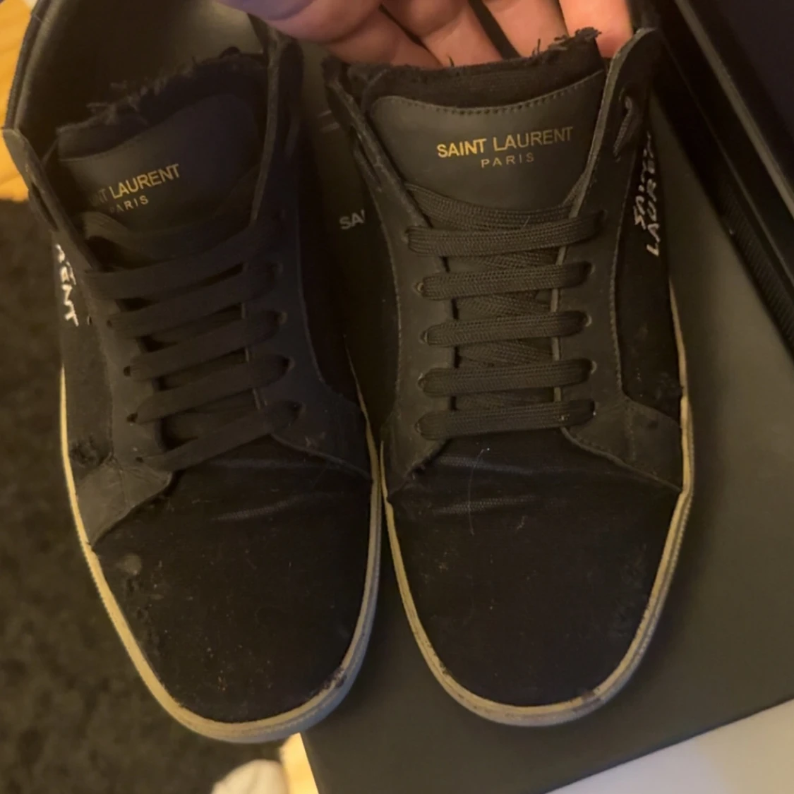 Säljer nu mina saint Laurent skor då de börjar bli försmå, köpta i somras så inte mycke slitna förutom vanliga grejer som sula och lite smuts, skick 8/10,