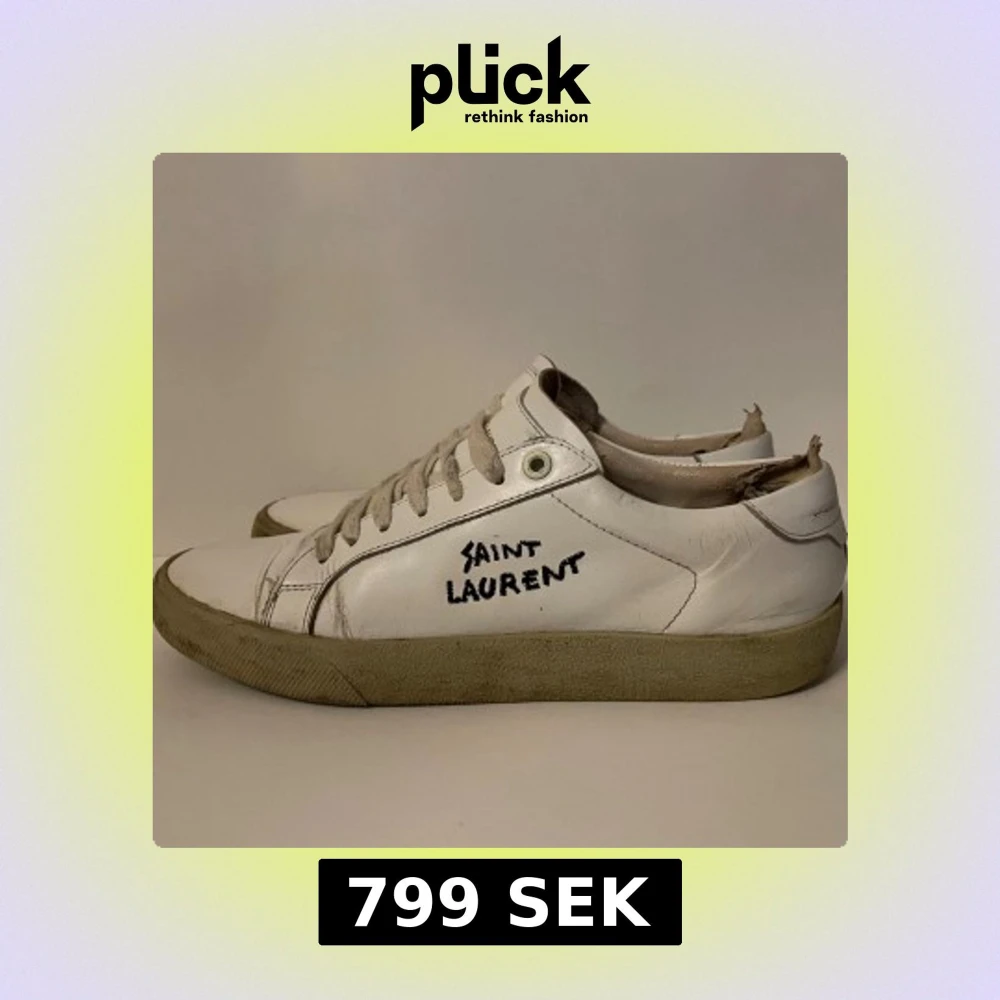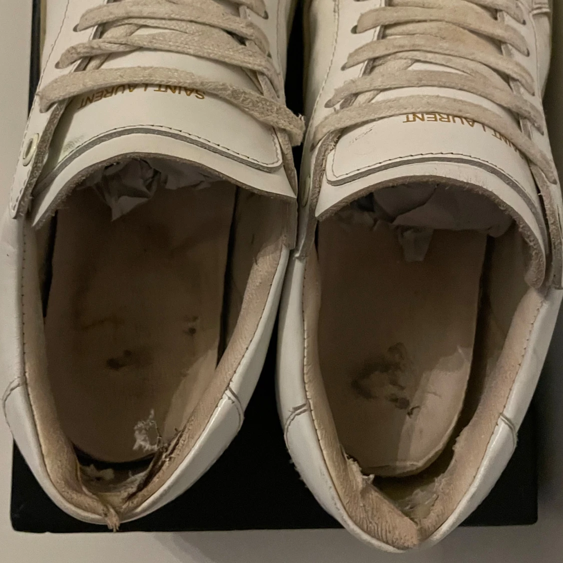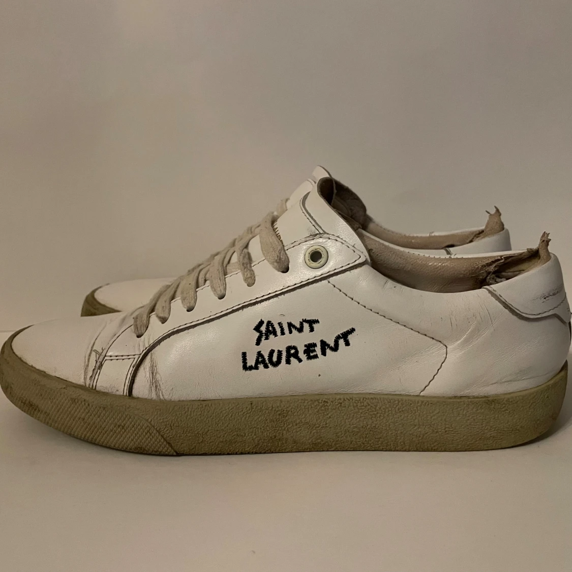 Säljer ett par vita Saint Laurent sneakers med handskriven logga på sidan. Är sliten på insidan men ser ny ut på utsidan. Skriv i dm om du har frågor. Man får också låda och lite andra saker.
