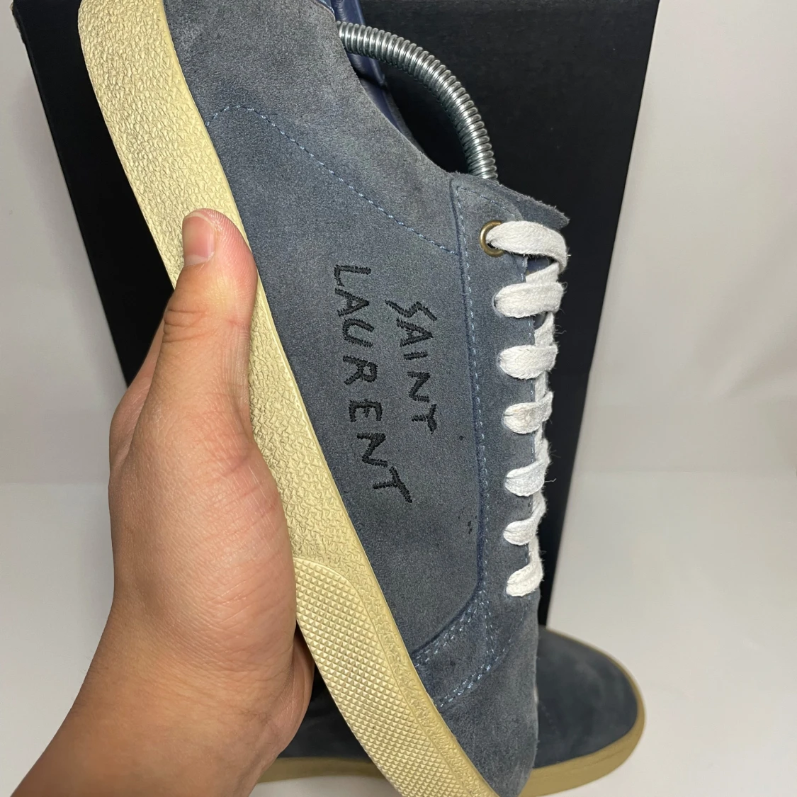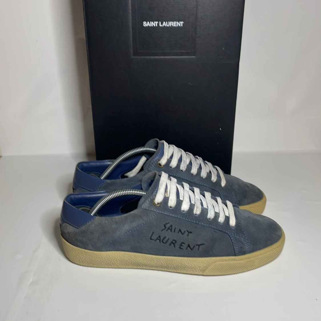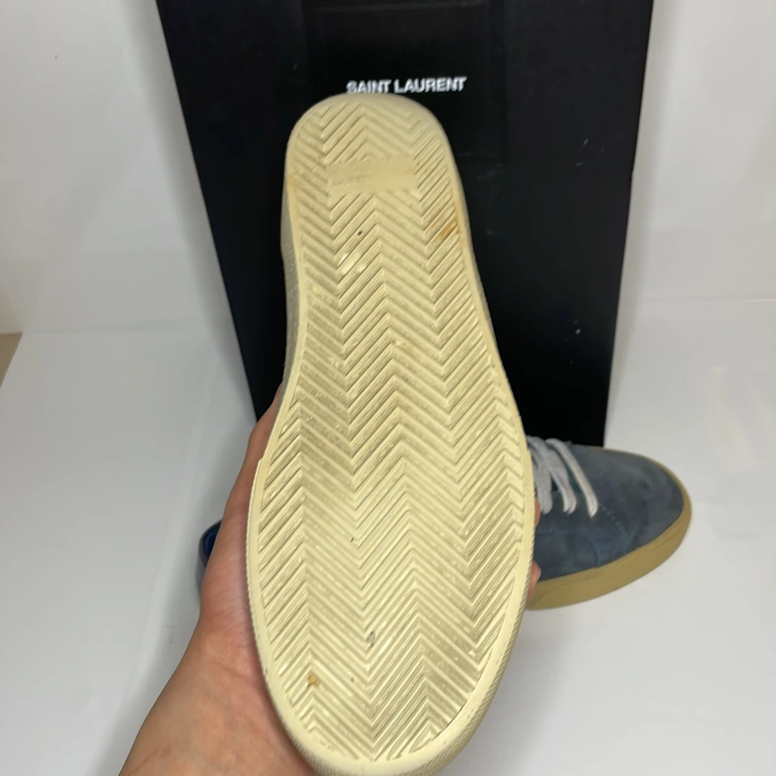 Snygga blå sneakers från Saint Laurent i mocka med vit snörning och beige sula. Storlek 39,5 men sitter som 40 Perfekta för en stilren look med den ikoniska loggan på sidan.