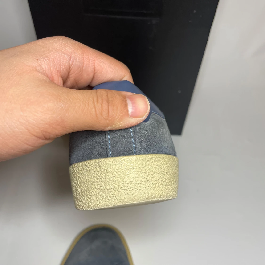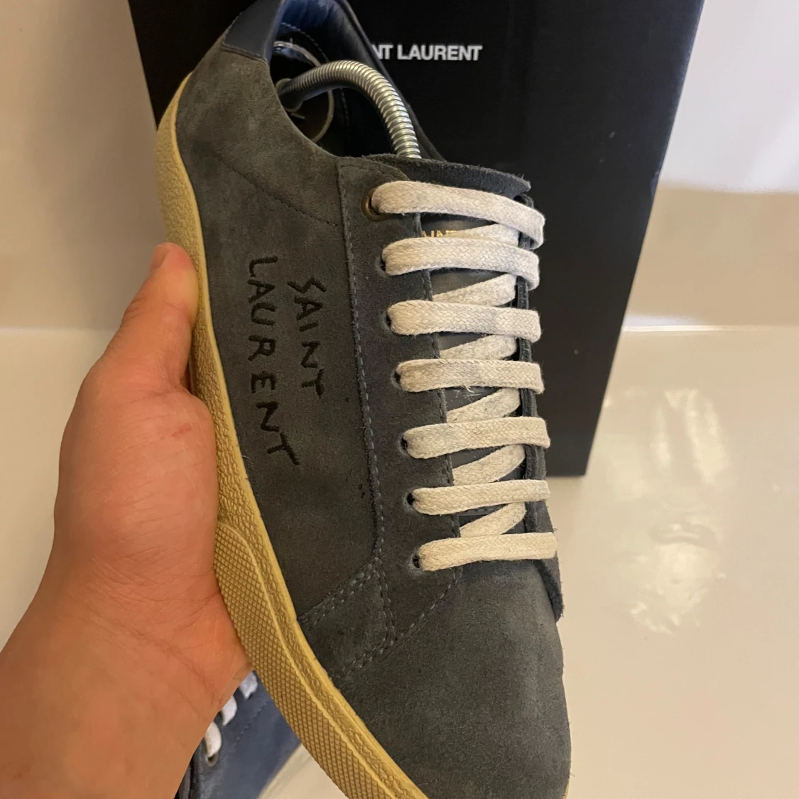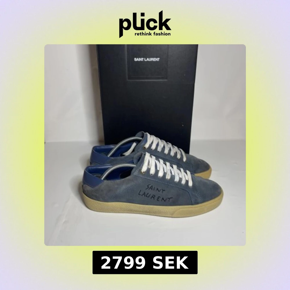 Snygga blå sneakers från Saint Laurent i mocka med vit snörning och beige sula. Storlek 39,5 men sitter som 40 Perfekta för en stilren look med den ikoniska loggan på sidan.