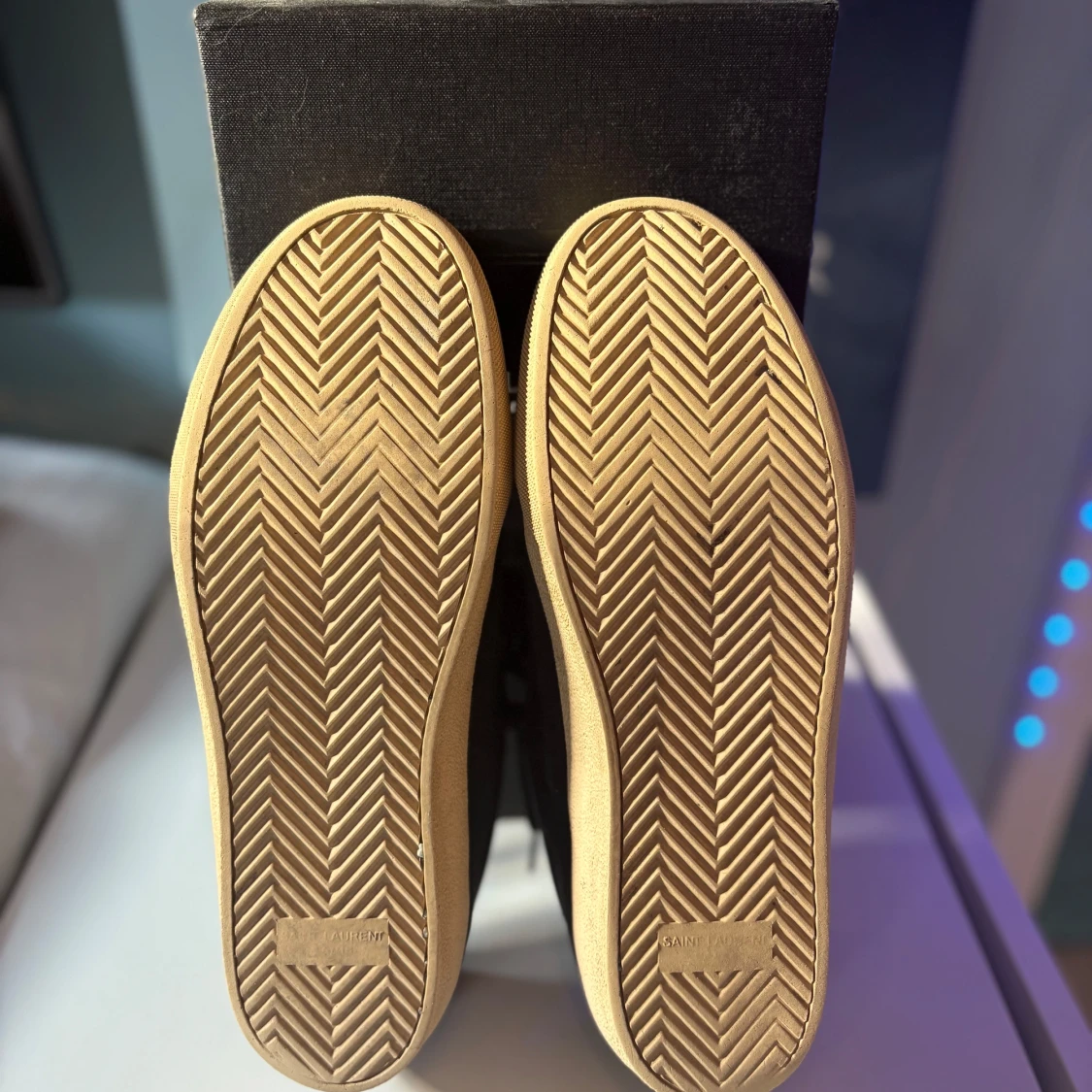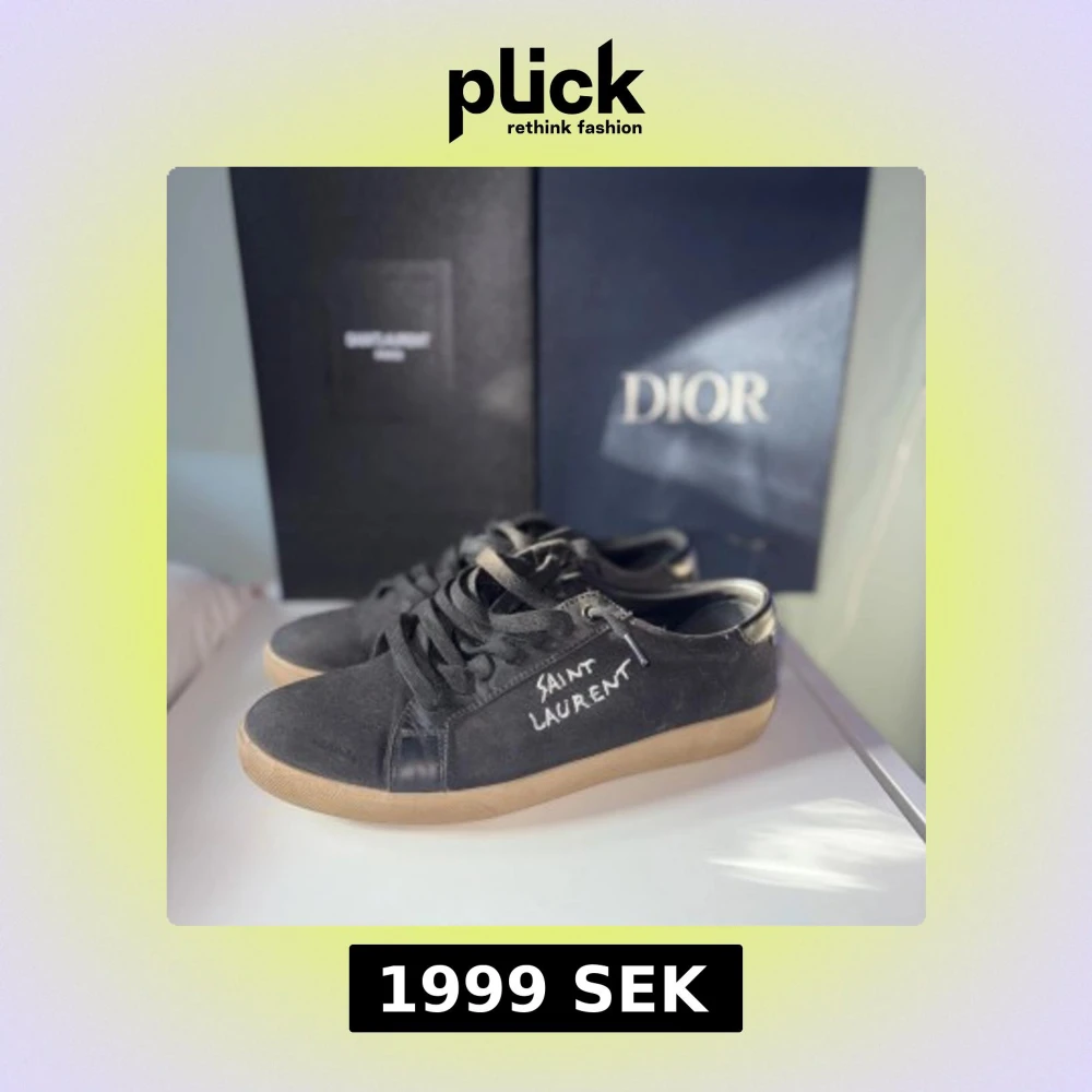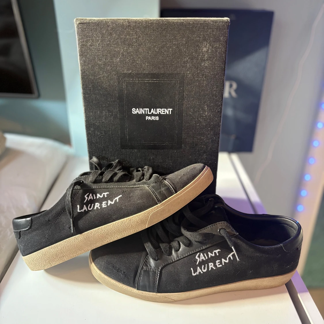 Svarta sneakers från Saint Laurent med vit logga på sidan. En av mina favoritskor men tyvärr är dom för små, därav säljer jag dom. Inte använda allt för mycket, så de är fortfarande i fint skick. Storlek 46 men jag tycker de sitter lite mer åt 45-hållet. Skon är 29cm, så går att tolka själv också. Box finns!