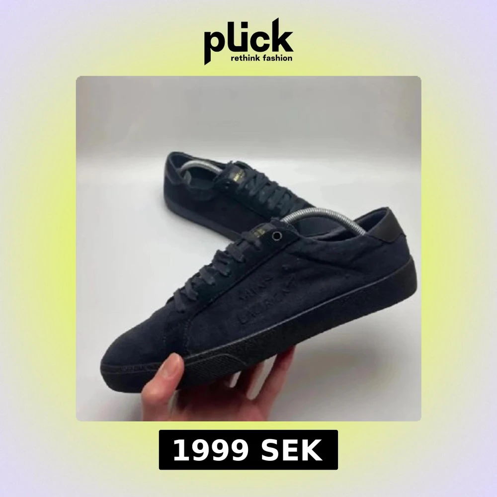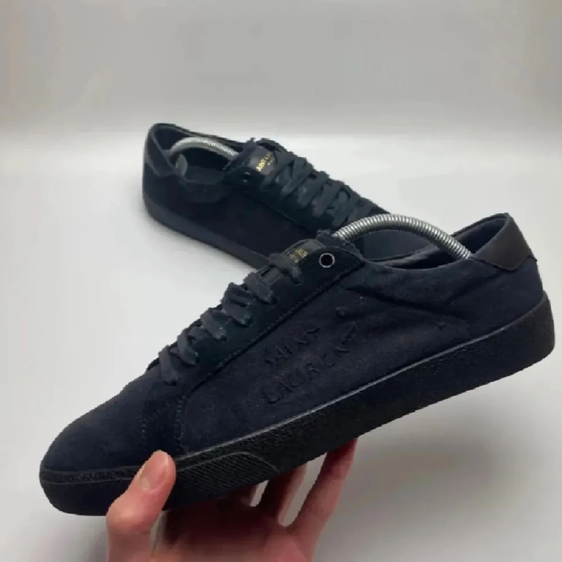 Snygga svarta sneakers från Saint Laurent med diskret logga på sidan. Skorna har ovandel i mocka och detaljer i skinn, samt svarta snören och platt sula. Perfekta för dig som gillar stilrena och exklusiva sneakers med en lyxig känsla.