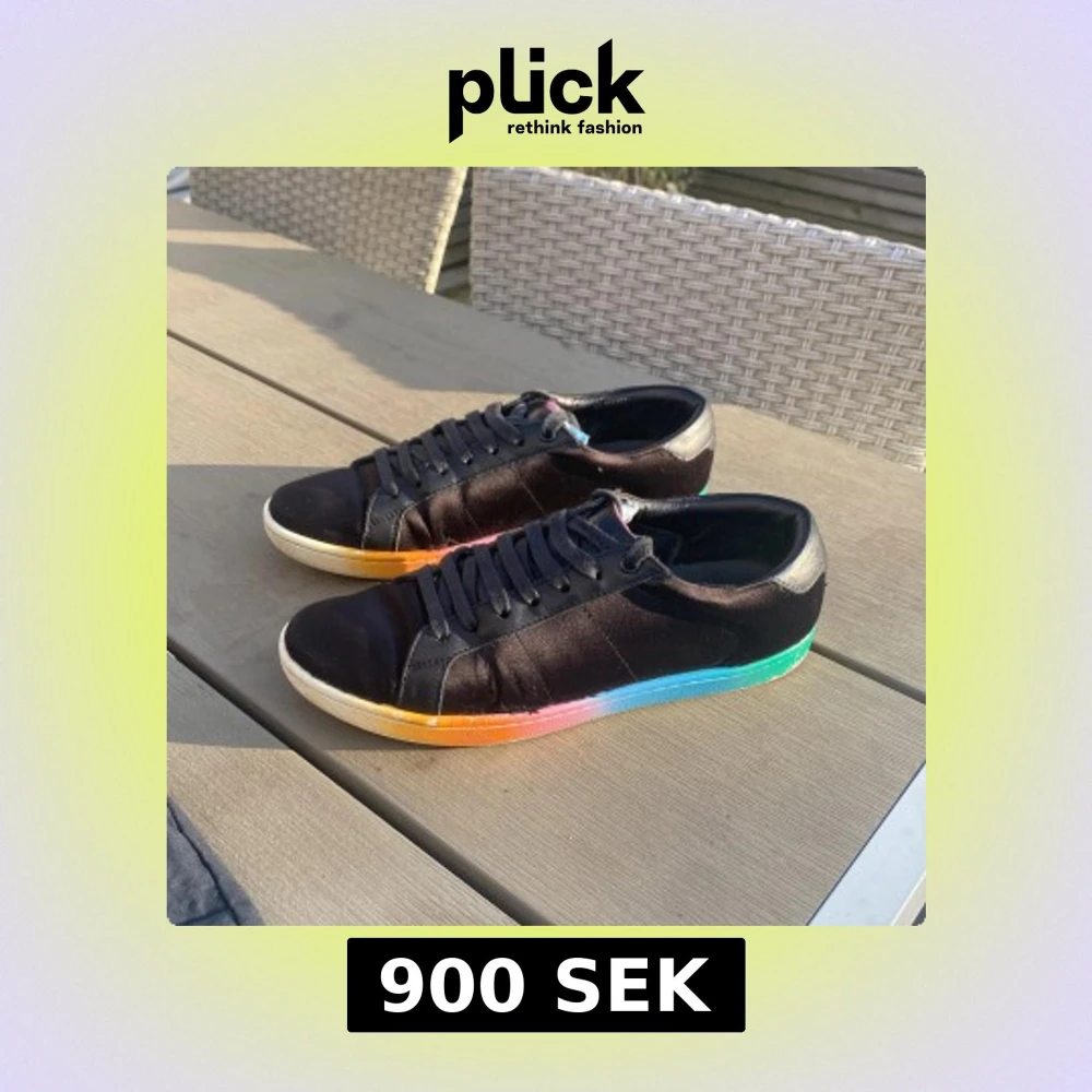 Svarta sneakers från Saint Laurent med snygg regnbågsfärgad sula i orange, rosa, blått och grönt. Skorna har snörning, rund tå och är tillverkade i skinn och textil. Perfekta för dig som vill sticka ut med en färgglad detalj på fötterna.