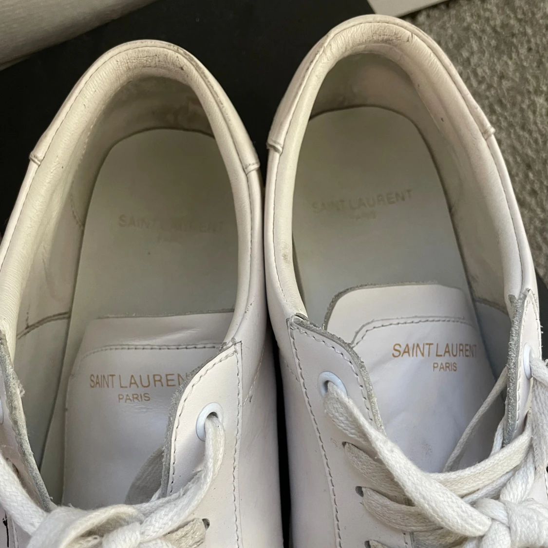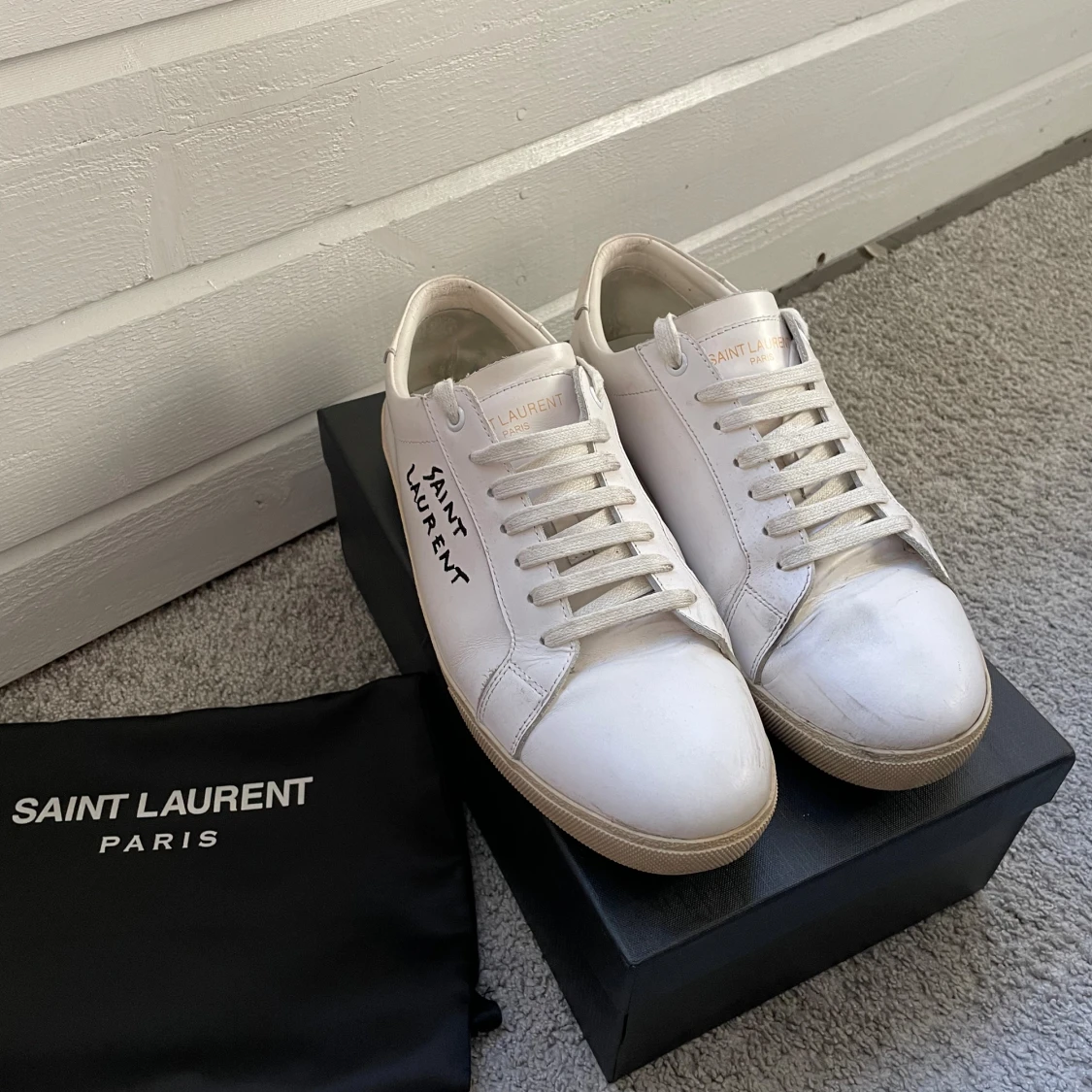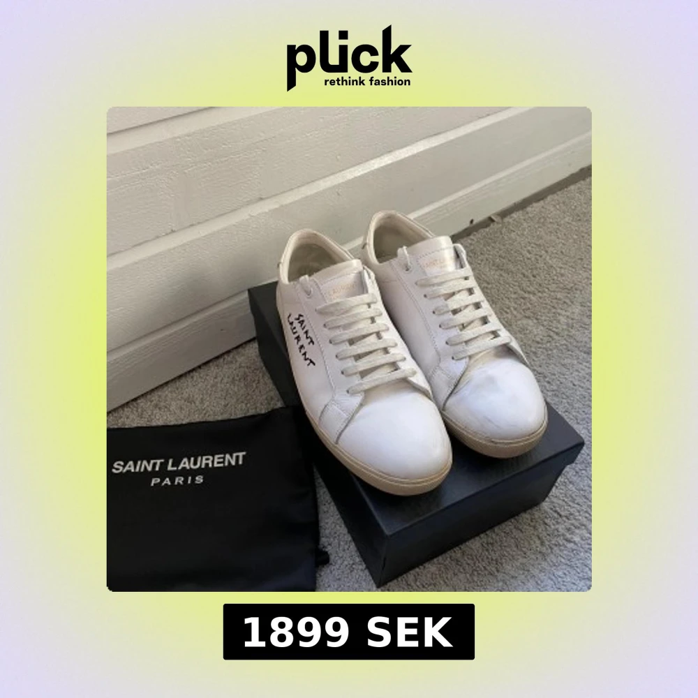 Säljer ett par klassiska vita sneakers från Saint Laurent Paris i storlek 44. Skorna är i skinn, har platt sula och snörning. Med en snygg handskriven Saint Laurent-text på sidan. Perfekta för en extremt clean och stilren look. Passar bra till alla outfits. Tveka inte att kontakta vid minsta fråga eller fundering 💭 Priset är självklart diskutabelt 💸