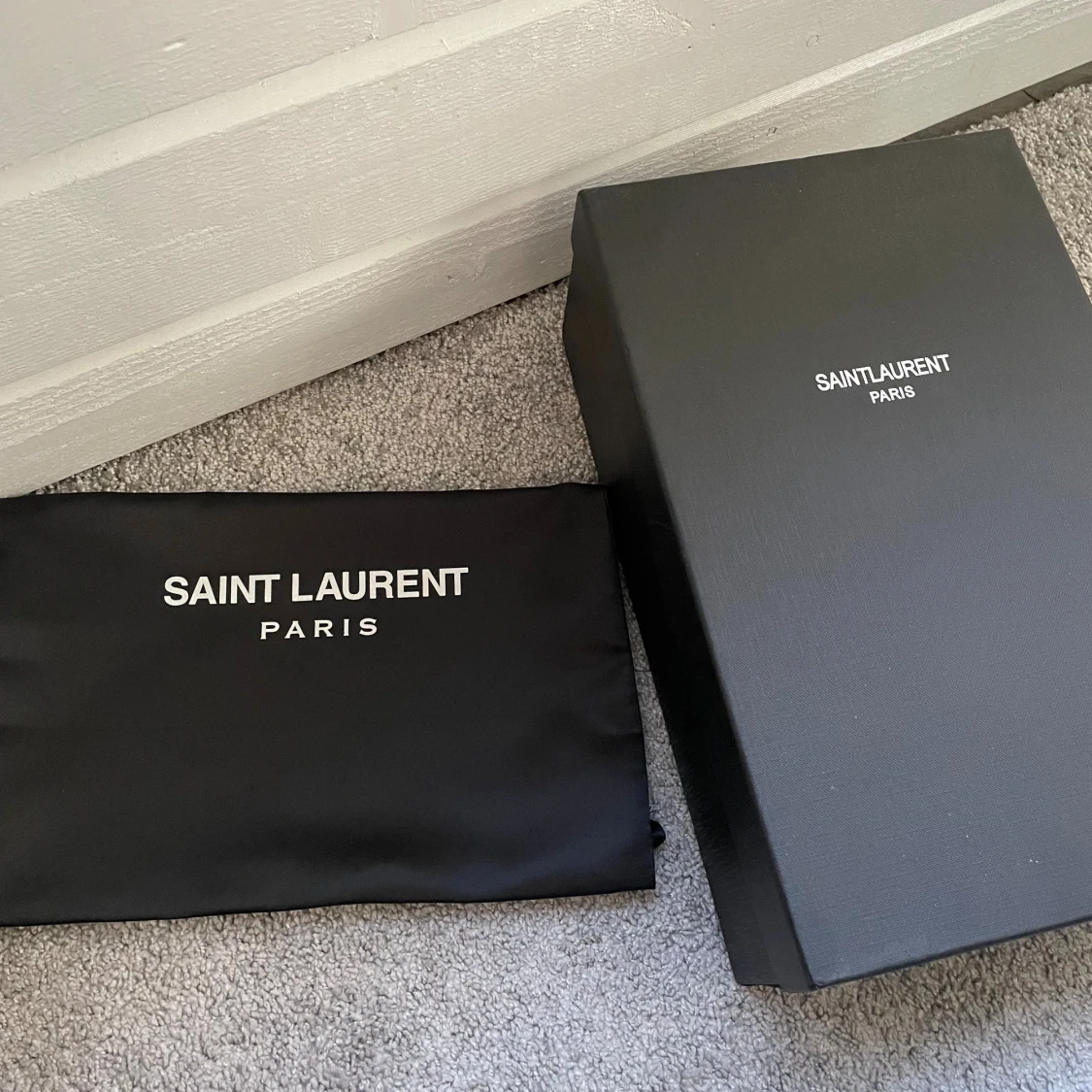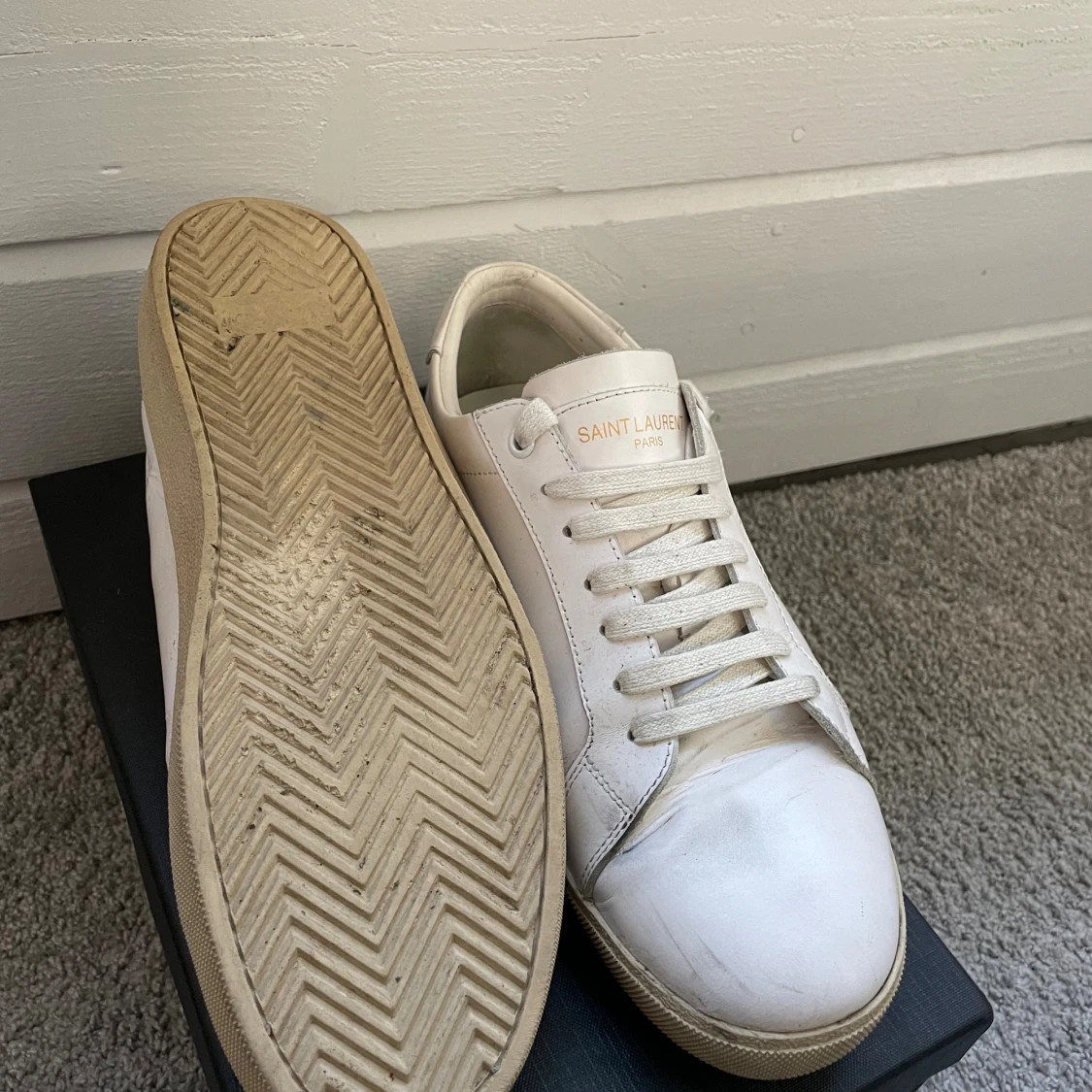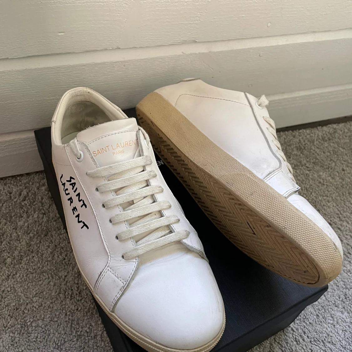 Säljer ett par klassiska vita sneakers från Saint Laurent Paris i storlek 44. Skorna är i skinn, har platt sula och snörning. Med en snygg handskriven Saint Laurent-text på sidan. Perfekta för en extremt clean och stilren look. Passar bra till alla outfits. Tveka inte att kontakta vid minsta fråga eller fundering 💭 Priset är självklart diskutabelt 💸