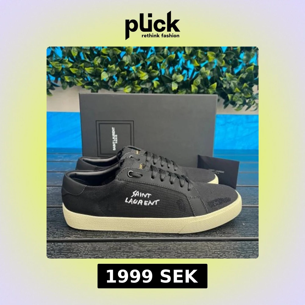 Snygga svarta sneakers från Saint Laurent med vit broderad logga på sidan. Det som medföljer är - Låda, dustbag, skoskydd och äktenshets kort, kvitto saknas tyvärr. Skorna har svart textil och skinnpaneler, svarta snören och en kontrasterande vit sula. Perfekt för dig som gillar stilrena och exklusiva skor. Helt nya och oanvända!
