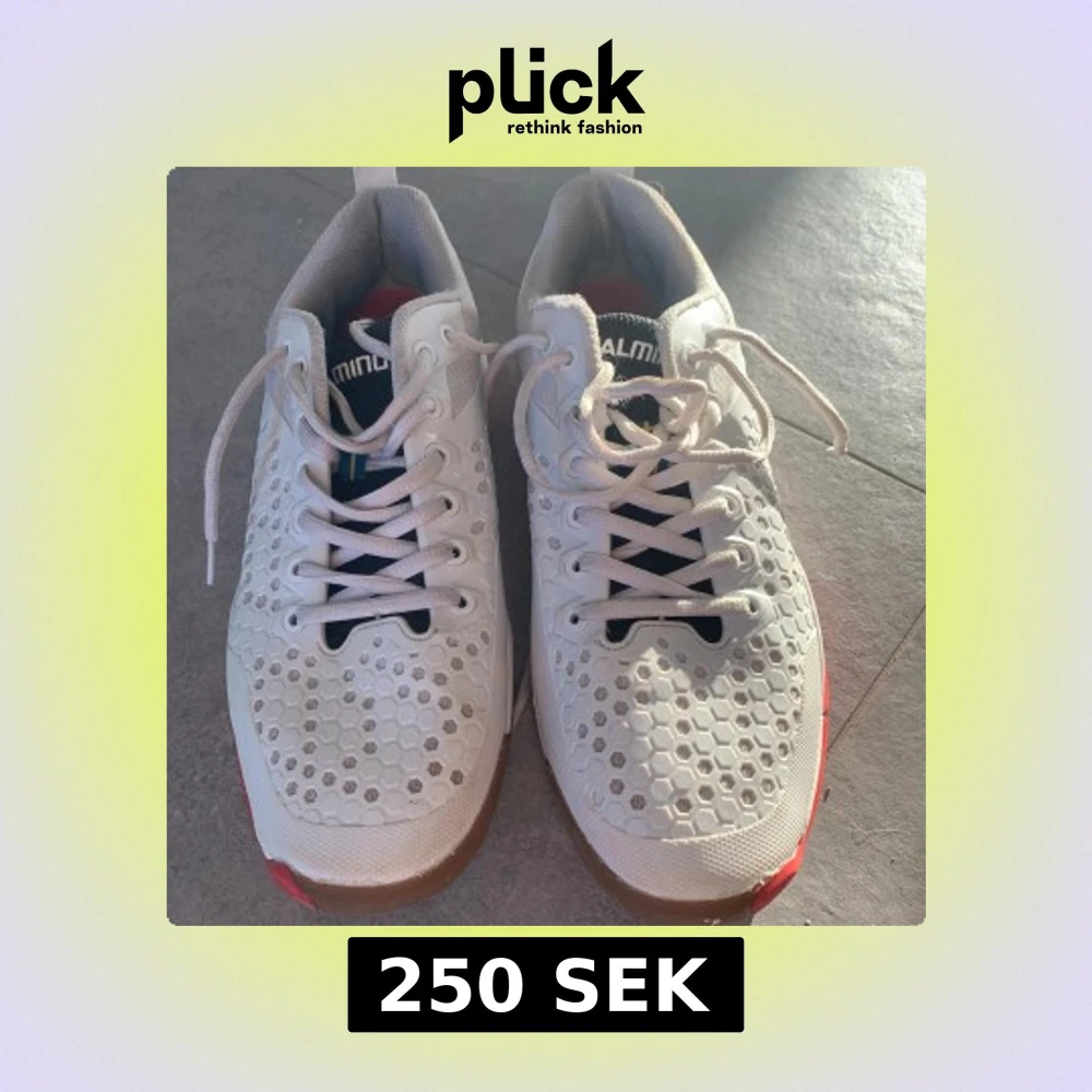 Säljer ett par vita Salming sneakers med sexkantigt mönster på ovandelen och röda detaljer på sulan. Skorna har snörning och en platt sula, perfekt för inomhusträning eller vardagsbruk. Märket syns tydligt på sidan och plösen.