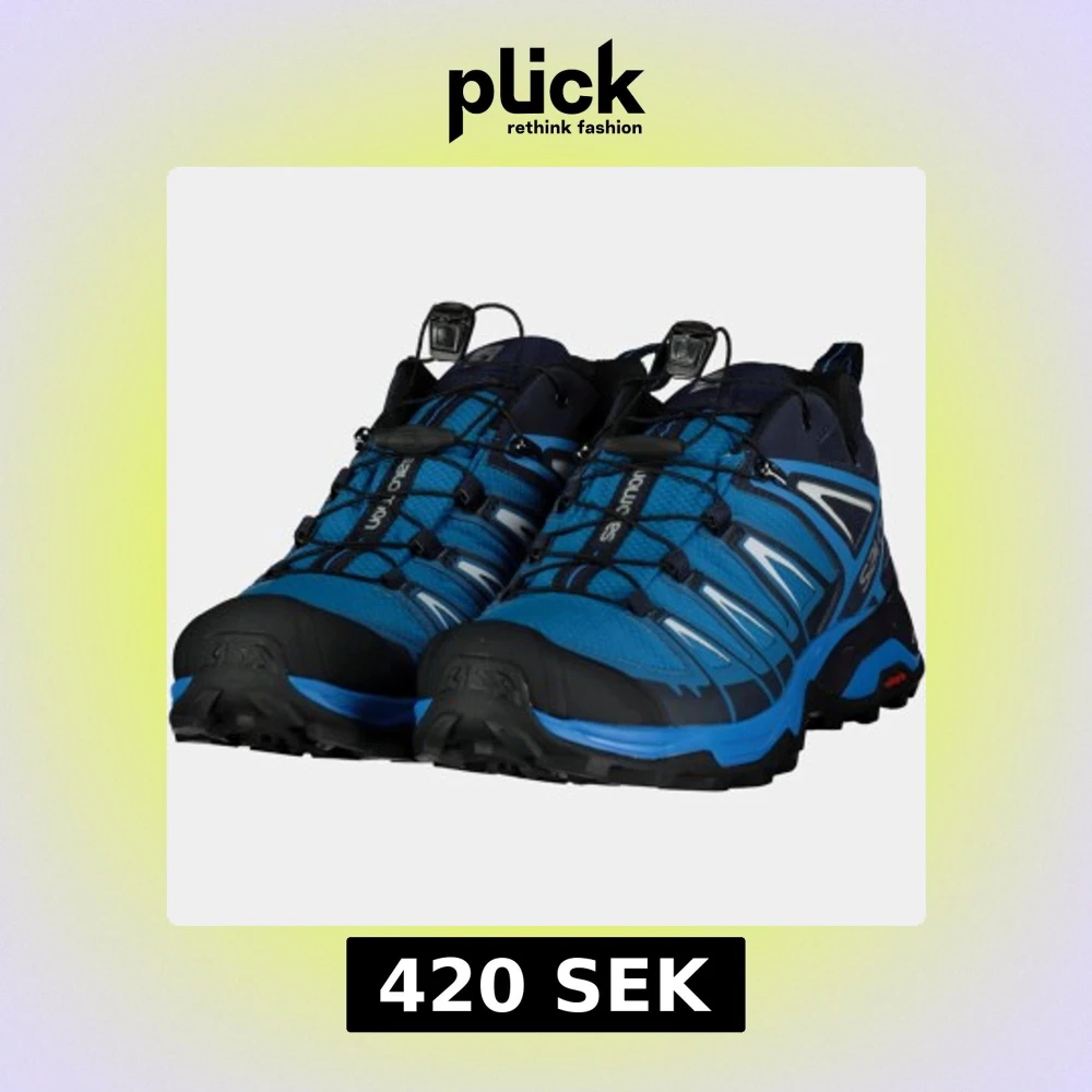 Säljer ett par blå och svarta Salomon sneakers med coola vita detaljer och snabbsnörning. Skorna har robust sula med grymt grepp och är tillverkade i syntetmaterial och mesh. Perfekta för dig som gillar att vara aktiv utomhus och vill ha en sportig look.