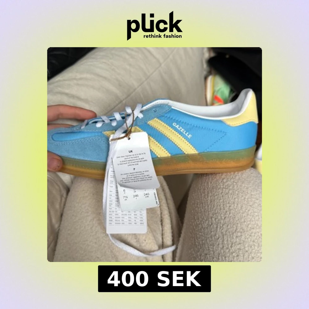 Adidas Gazelle sneakers i fräsch ljusblå färg med gula detaljer och vita ränder. Skon har en klassisk låg siluett, platt gummisula med Adidas-loggor undertill och snörning framtill. Ovandelen är i mocka och syntet, med vit insida och gul häl. Aldrig använda