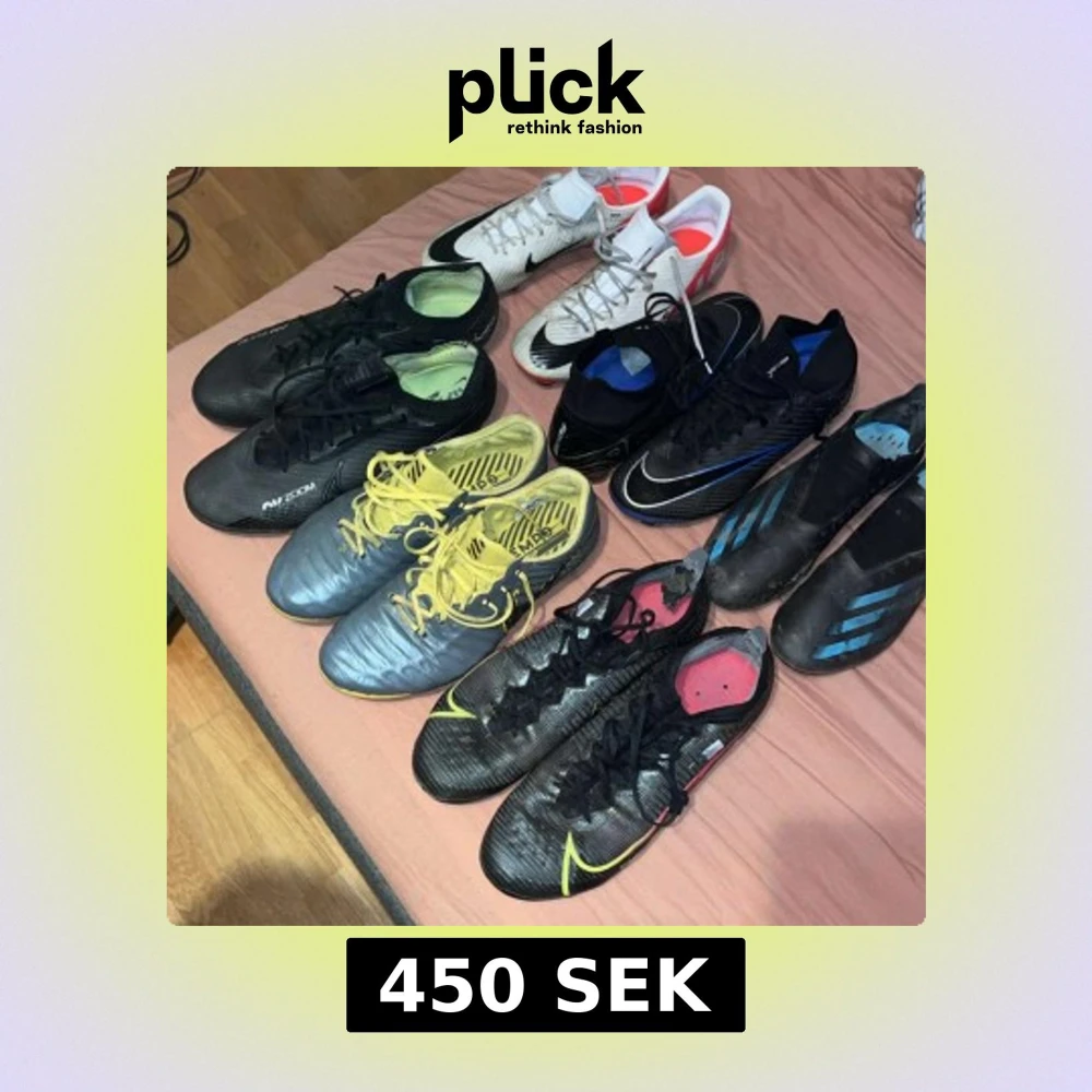 En samling av fotbollsskor i olika färger och märken. Skorna inkluderar svarta, vita, blå och gula modeller med snörning. Storlek 42-45! 450kr styck.
