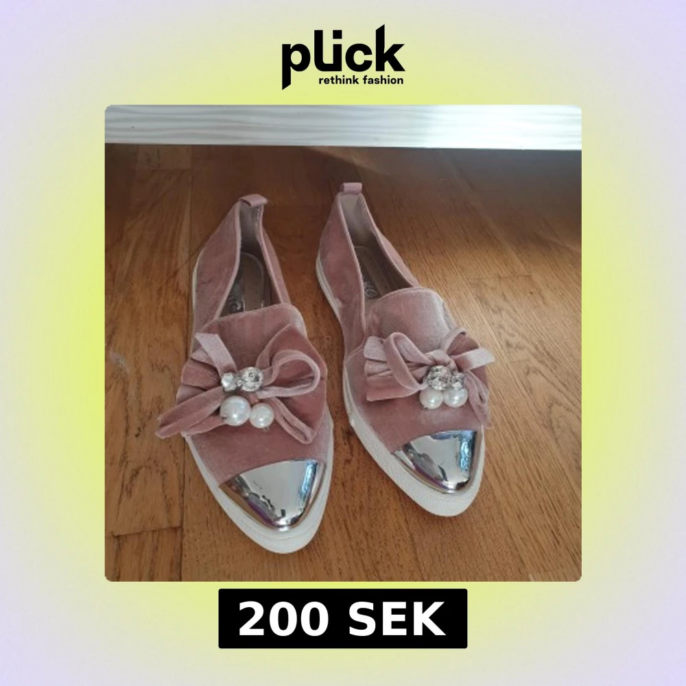 Snygga rosa loafers i sammet med dekorativa rosetter och pärlor framtill. Skorna har en metallisk spetsig tå och en vit sula. Perfekta för att ge en touch av glamour till din outfit. Använda 1 gång bara.