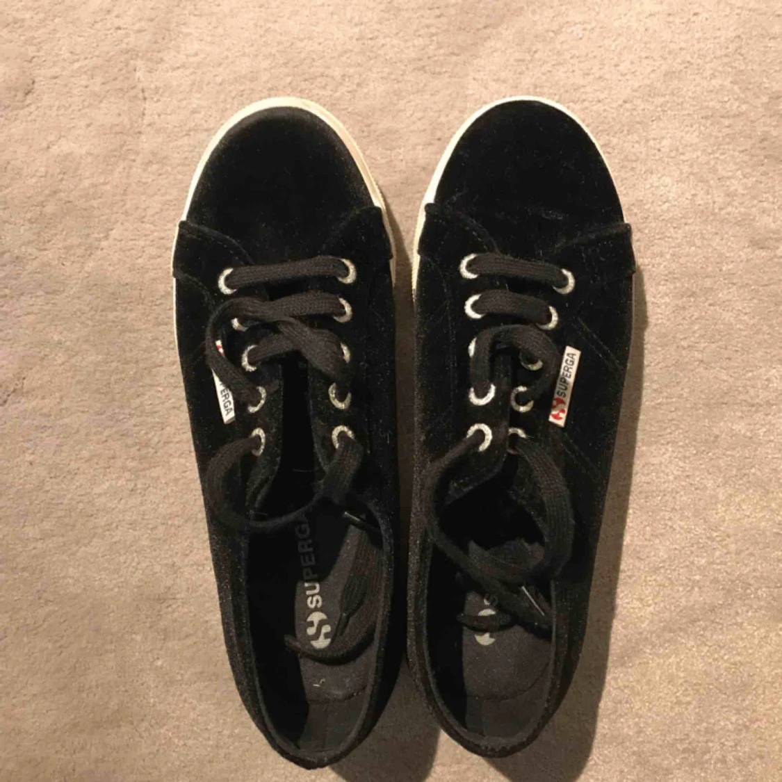 Jättesnygga svarta platåskor ifrån Superga i sammet. Använda ca 5 gånger, nästan som nya. Säljer pga använder ej. Fraktar eller möts upp i Stockholm.