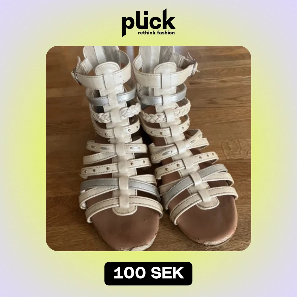 Sandal i skinnimitation med dragkedja i hälen. Endast lite skav i sulans främre kant. Annars hela och i fint skick.