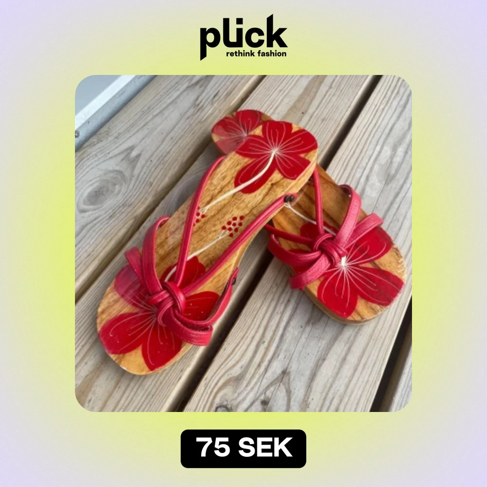 röda lädersandaler med blommig lackad träsula. I väldigt bra skick men tyvärr för stora för mig