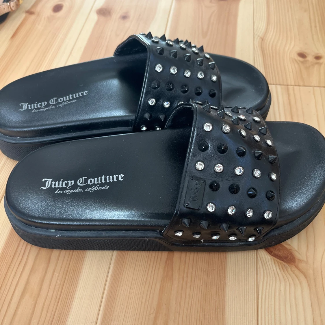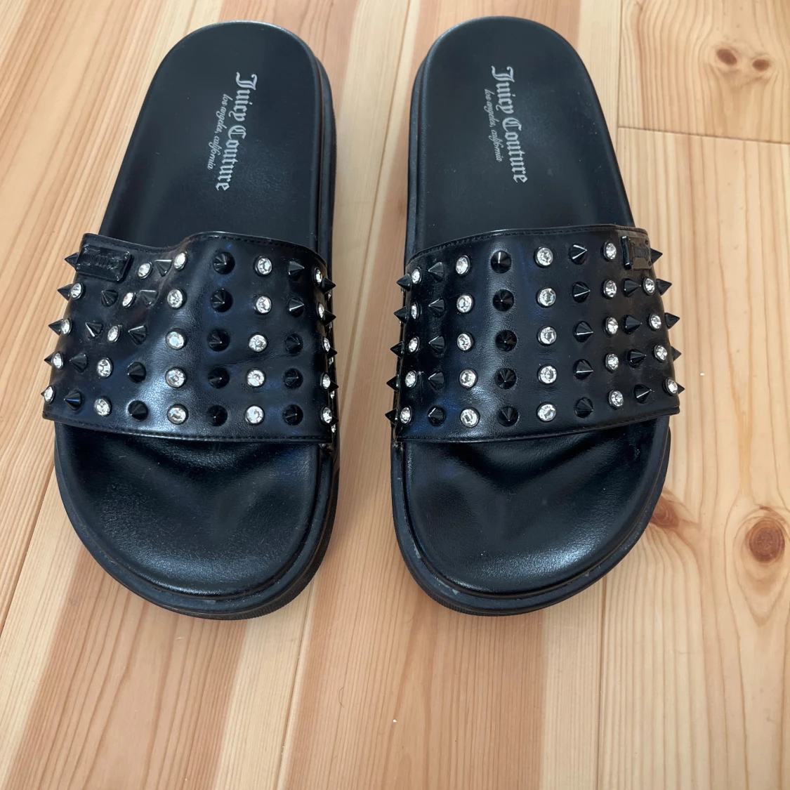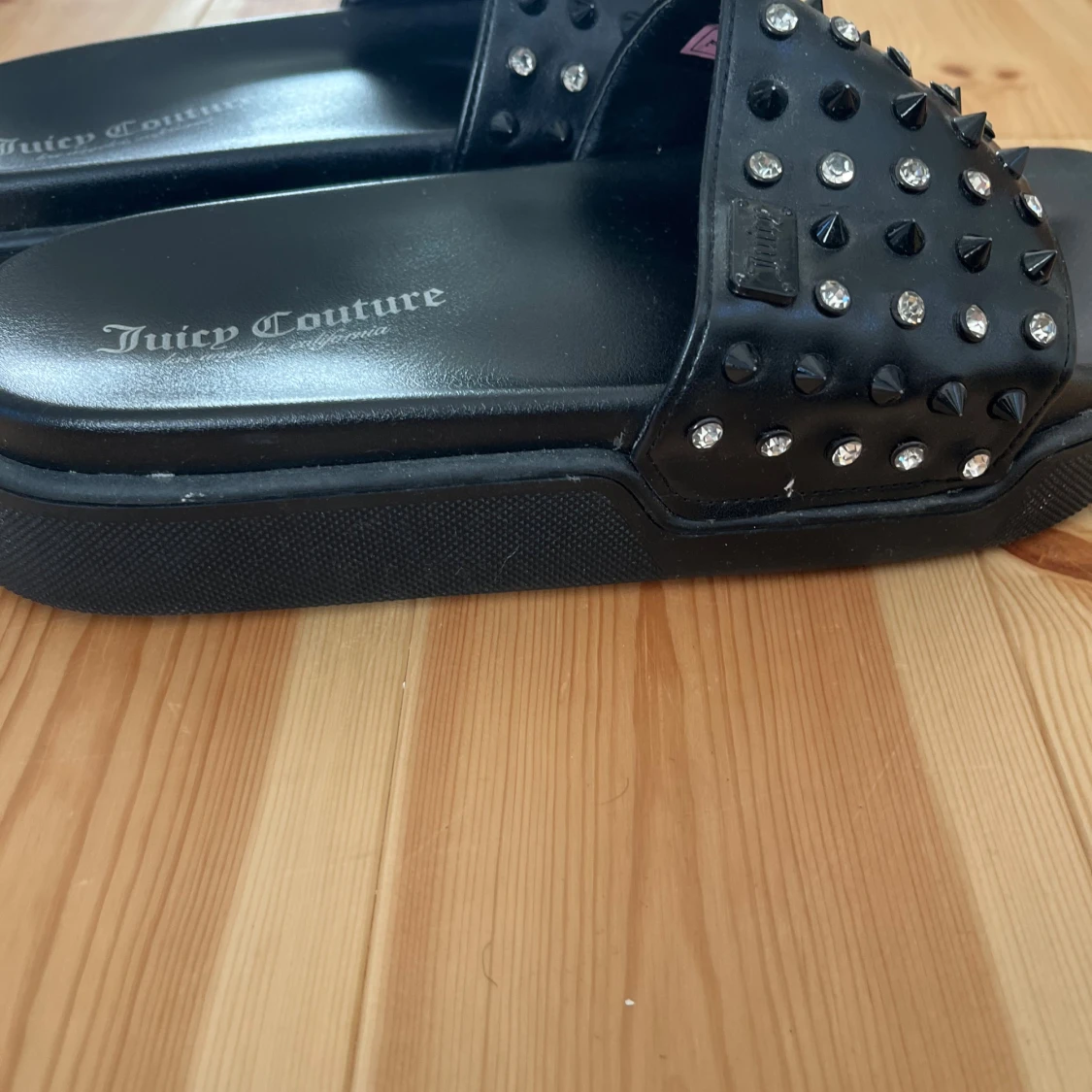 Svarta sandaler från Juicy Couture med bred rem dekorerad med svarta nitar och glittrande stenar. Snygg chunky sula och logga på fotbädden. Perfekt statement-piece för dig som gillar edgy detaljer